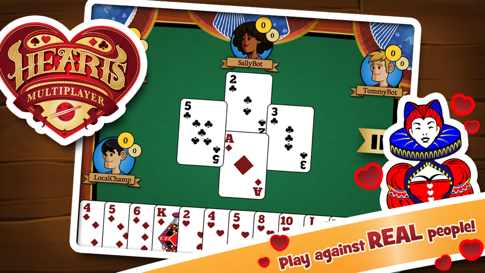 Everyone loves playing the Hearts card game, but let’s be honest, when you’re playing against a computer it’s just too easy. Well, we’ve got something much better for you: Hearts with real multiplayer games! Don't worry, it includes a single-player mode too!