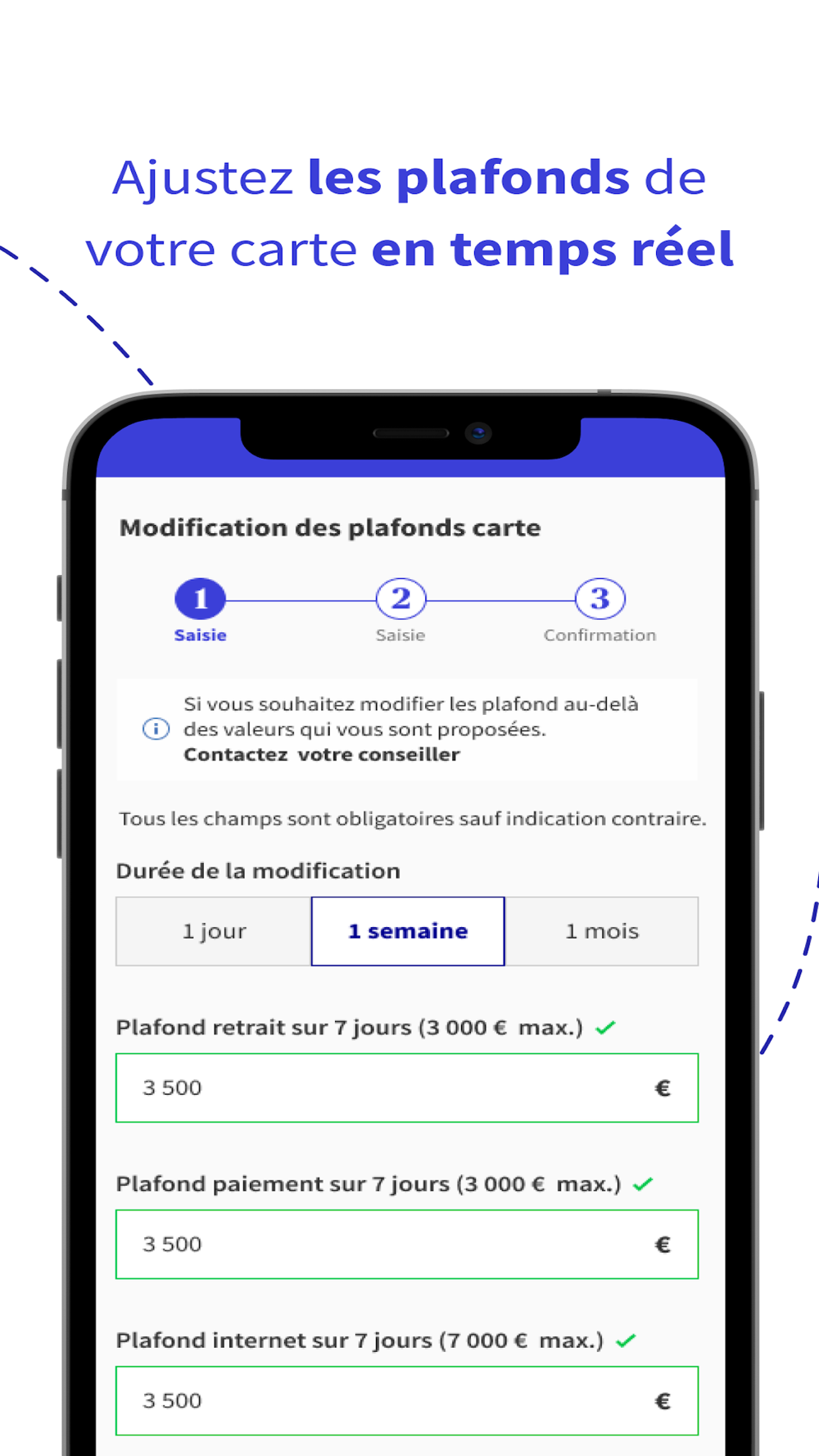• Modifiez instantanément vos plafonds d’achats et de retraits de votre carte bancaire selon votre besoin,