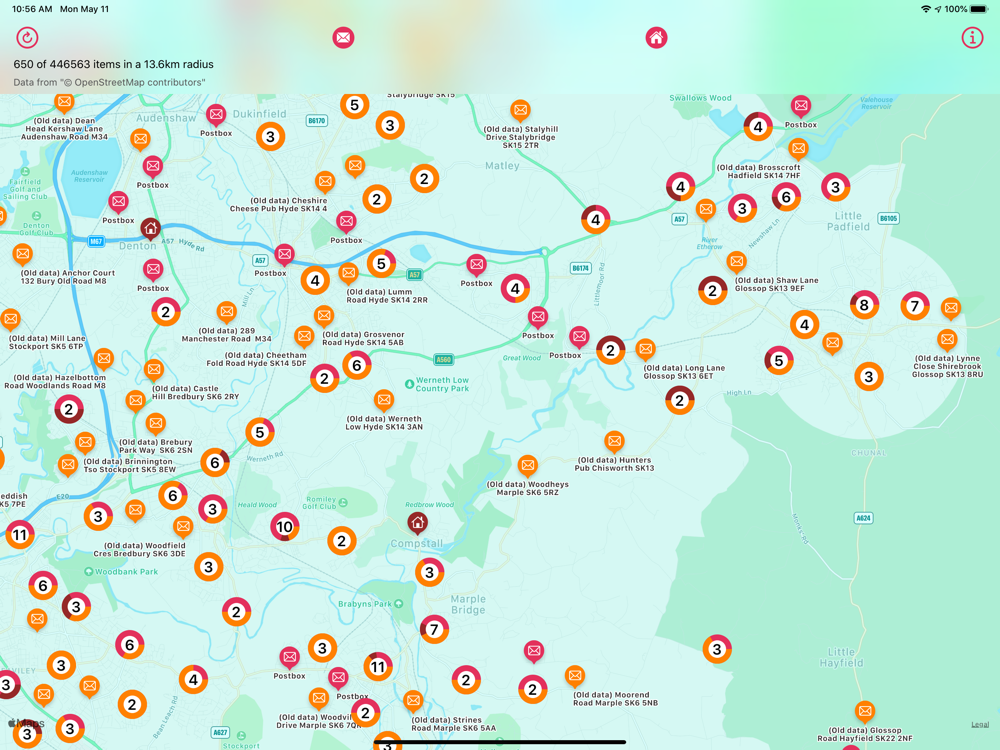 There is a whole new interface to the app that allows you to request data updates from OpenStreetMap within 16km of the centre of the map, you can now use toggles in the top menu to allow you to filter to only see postboxes, post offices or both. There is new clustering functionality in the map interface so that you can better see the information on the map, and a new circular radius overlay that helps you see clearly the area that you are currently viewing postbox data within, since we cannot place all 400,000+ data items on the map at once.