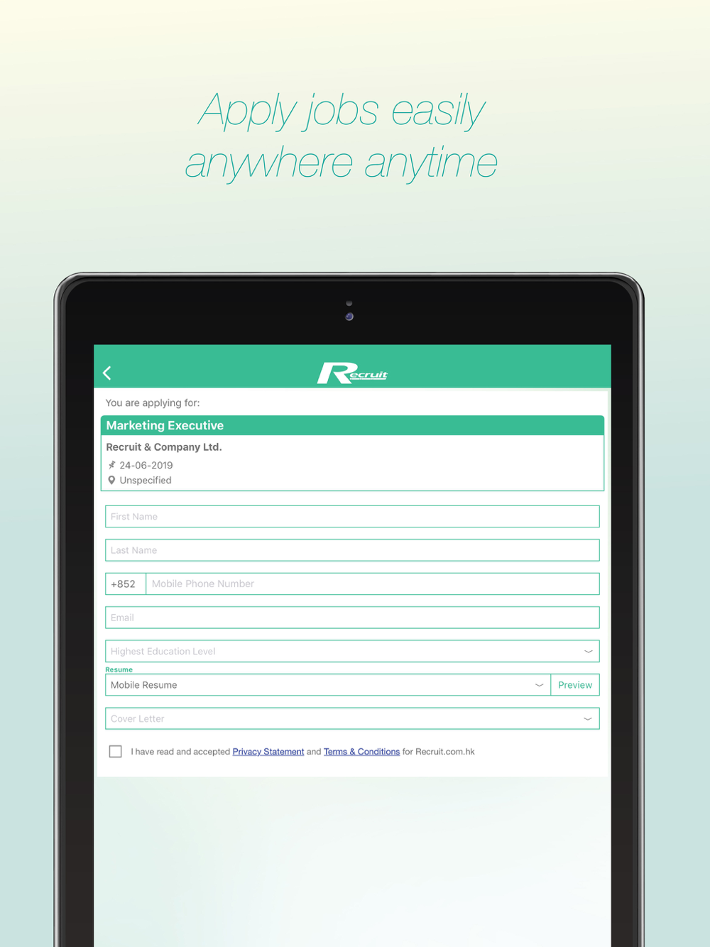 To activate the job application feature, you can simply upload your resume to your account with Recruit.com.hk. You can hence apply your ideal jobs in a click anytime, anywhere.