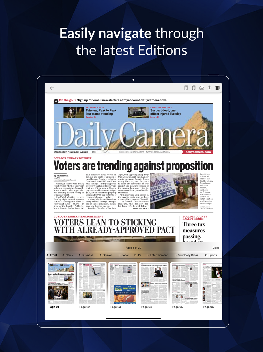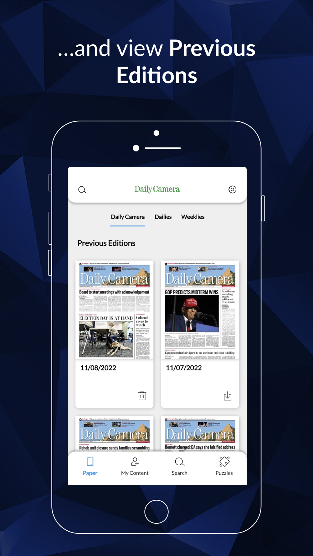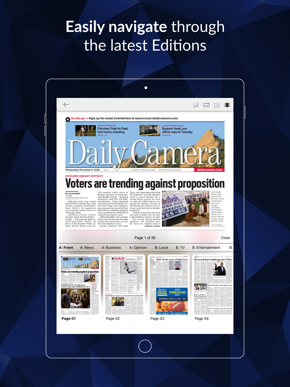 This app is specifically for Daily Camera e-edition readers. It was designed for ease of use for our e-edition readers. You can view a digital version of the Camera every day and even view old editions.