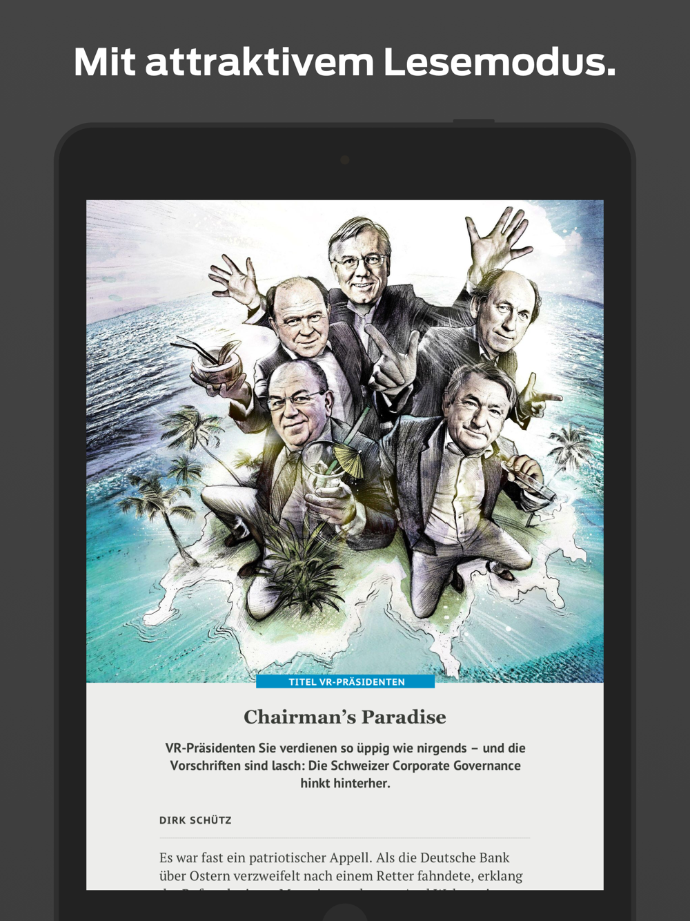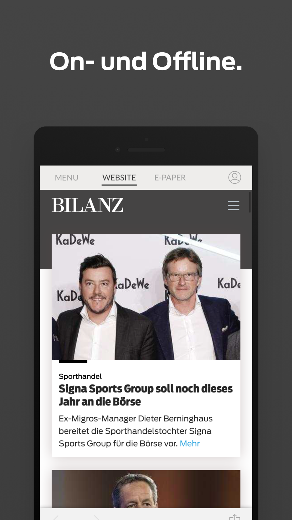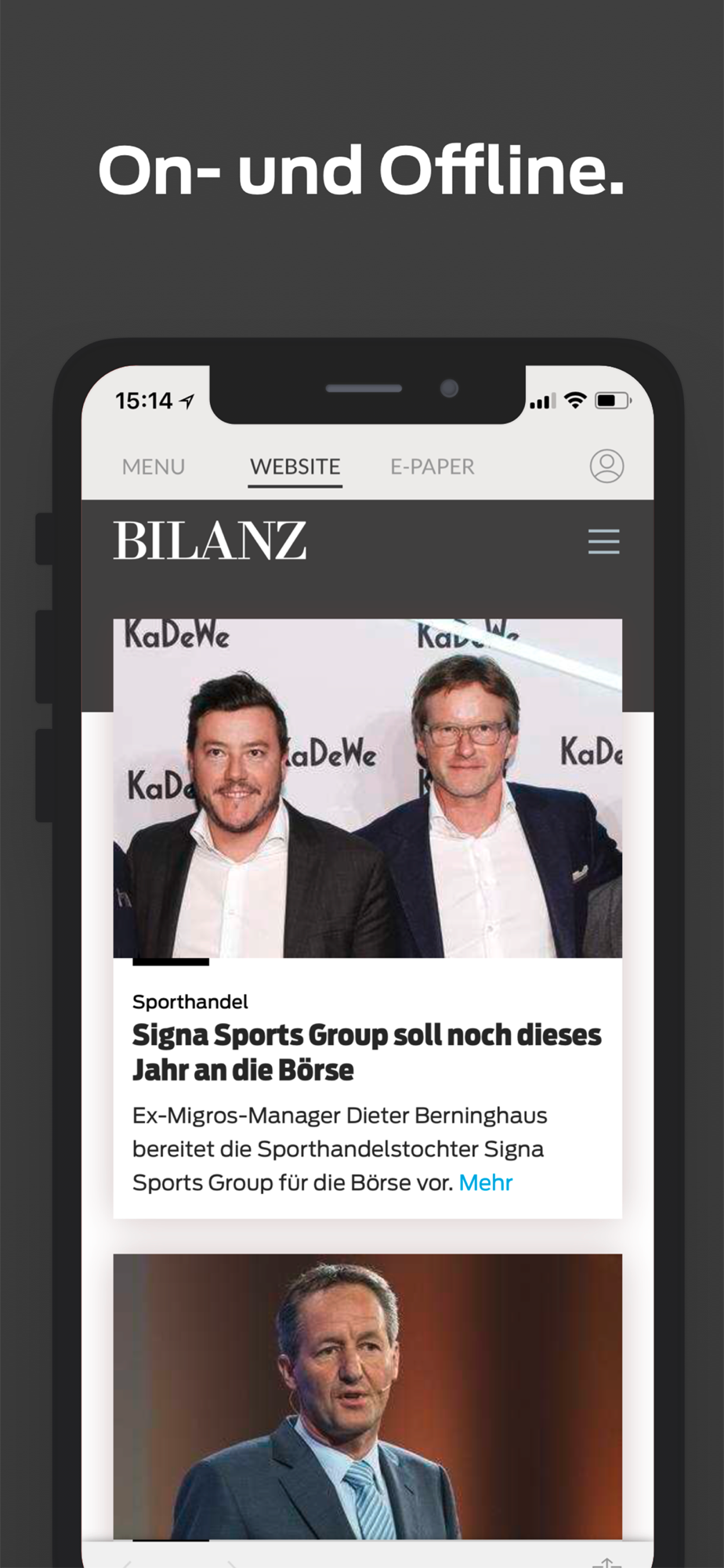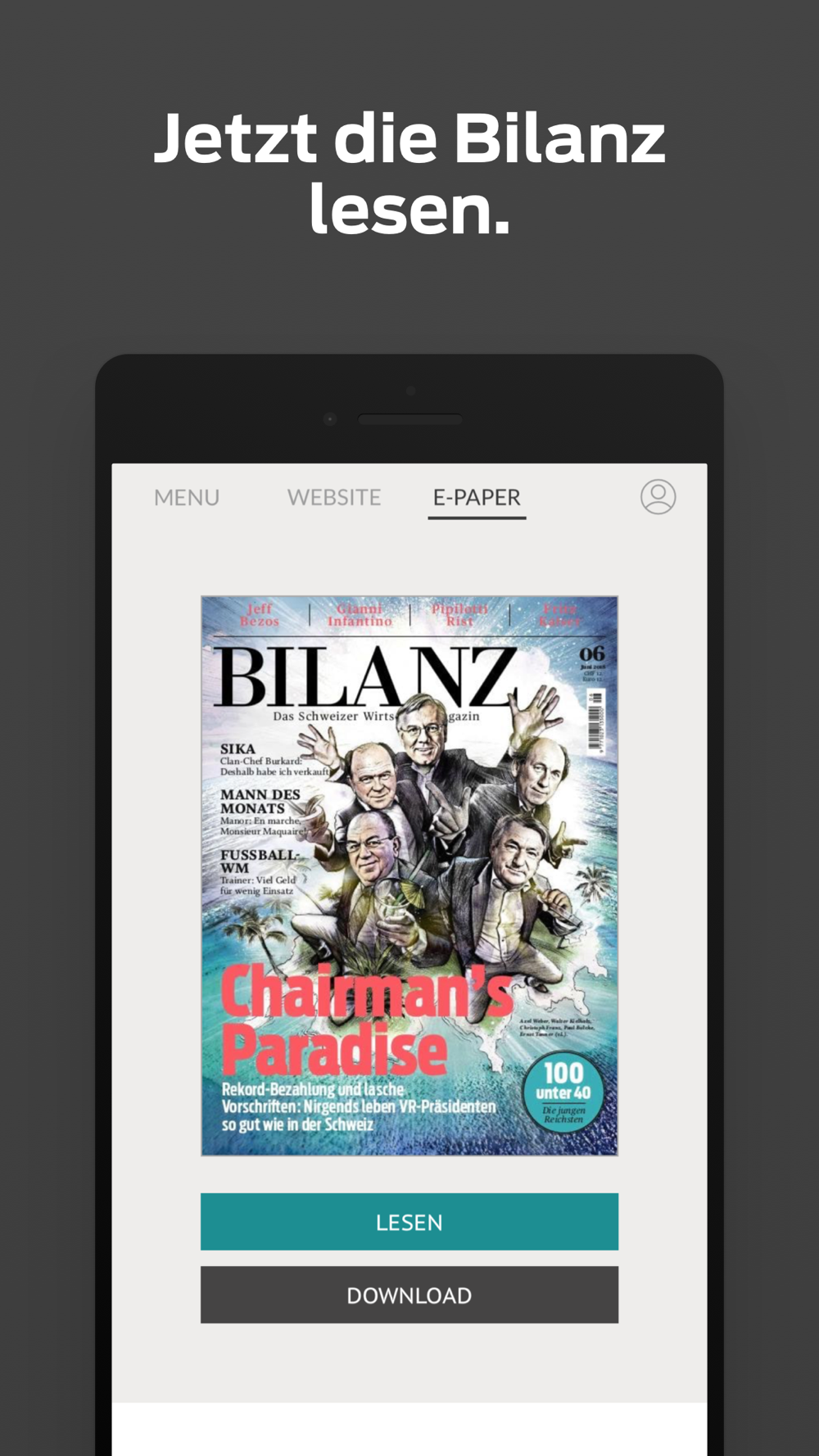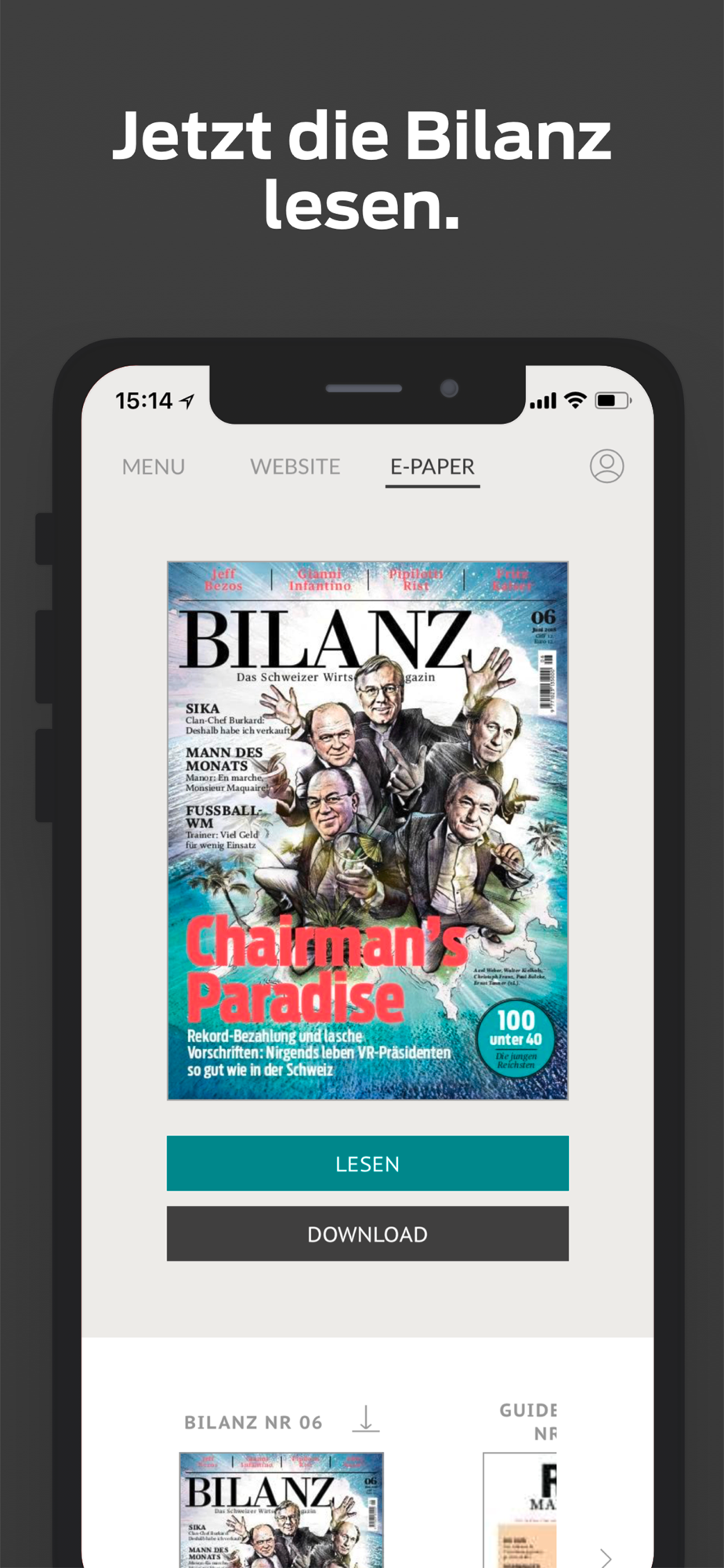 Ein neuer Bereich in der App bietet Ihnen „Aktuelles von bilanz.ch“. Sie werden mit personalisiertem, recherchiertem Wirtschaftsjournalismus, Bildergalerien und Luxus für jeden Geschmack überrascht.