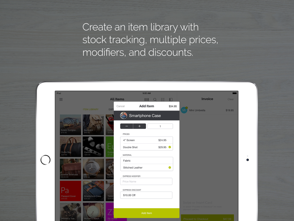 - Credit card processing with the free Phone Swipe app, card reader, and merchant account
