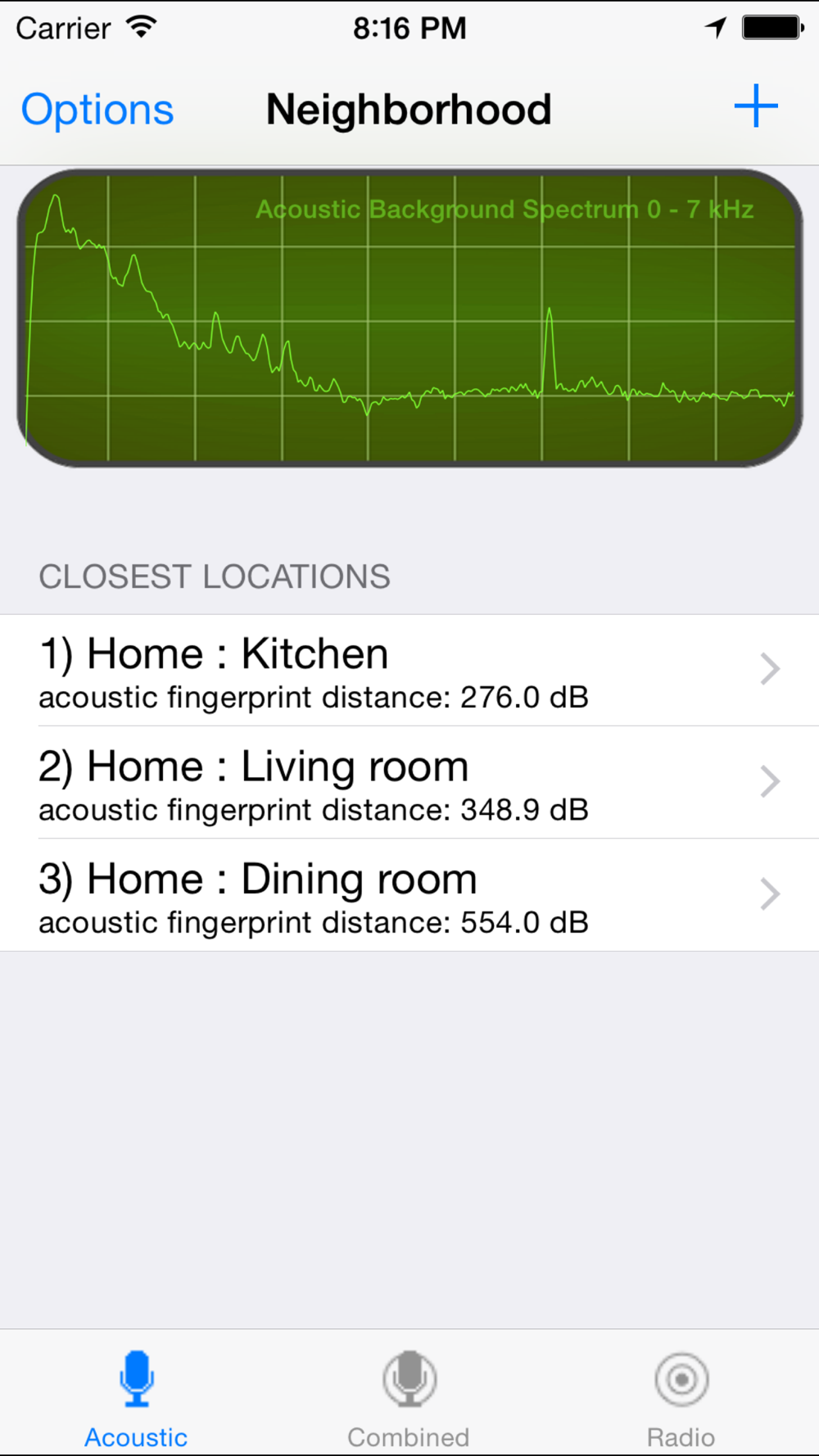 Batphone is a research tool which demonstrates a method determining your location within a building. It's meant to be an alternative to GPS or iBeacon, and it works by using the microphone to record room ambience. These acoustic room fingerprints are used to recognize previously-tagged rooms when they are revisited. For comparison, it also shows the position retrieved from Location Services, which determines your coordinates using radio signals from GPS satellites, wifi and cellular base stations. Our experiments have shown that Batphone's acoustic method is more accurate than the radio method. Try it for yourself and let us know what you think!