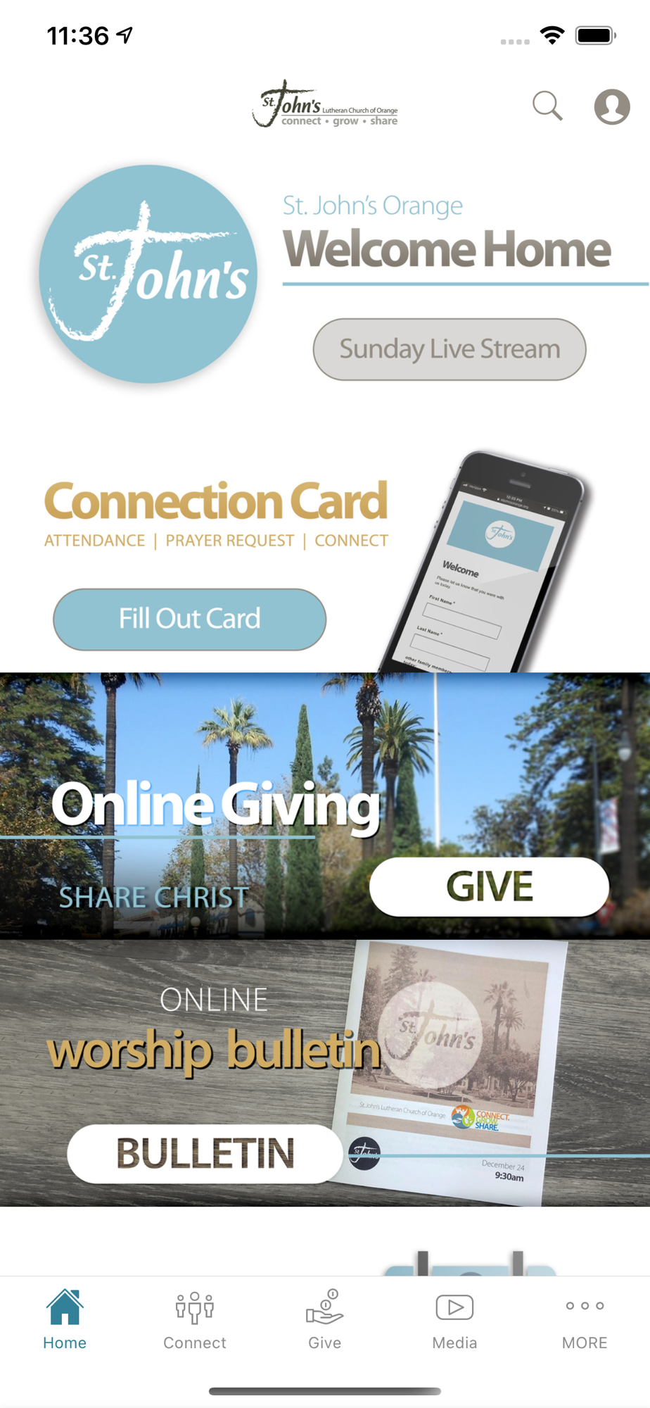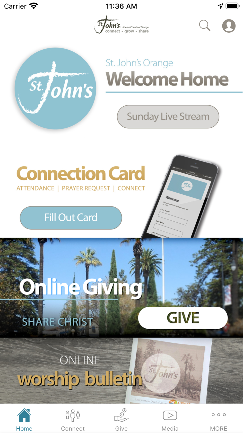With this FREE app you will always have a connection to St. John’s at your fingertips. Includes: St. John's Media Library with audio and video messages and The Sanctuary video live stream, Event Calendar, Prayer Request form, Quick access to Online Giving, customizable notifications, and more!