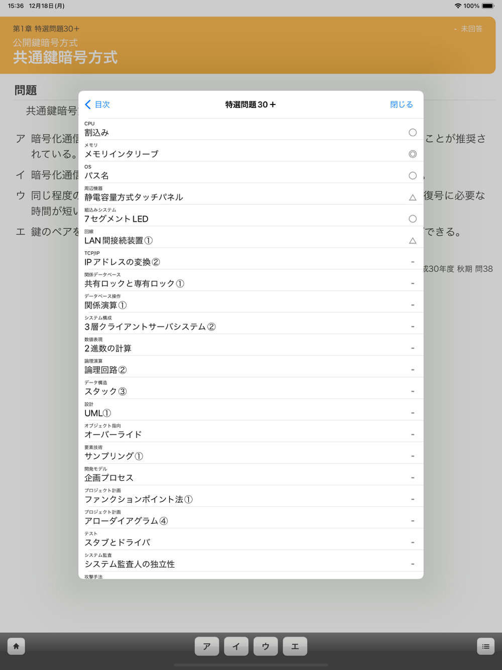 Additionally, results will be displayed on the table of contents. You will find your weak points at a glance. This feature support you to conquer your weakness. Let's get basic knowledge for the certification, and conquer your weak points with this application.
