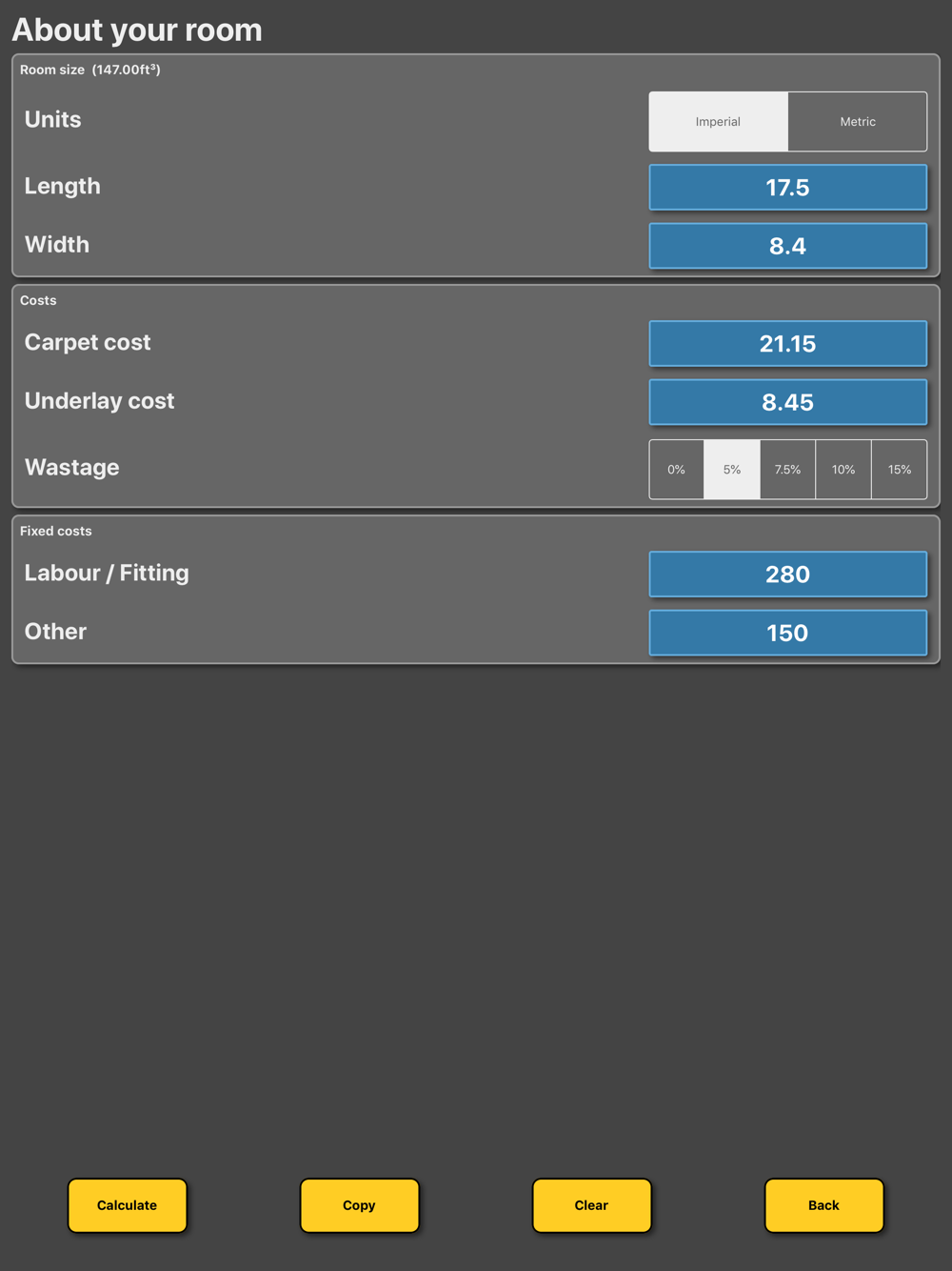 Finally, you can add fitting costs and any other cost that may arise and then the app will determines the likely cost for carpeting that room.