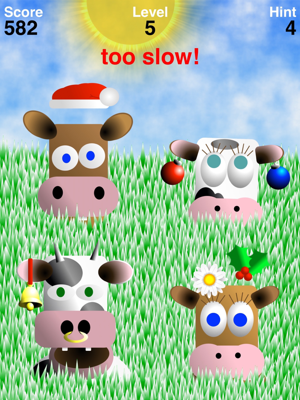 Simoo Seasons is a special seasonal version of Simoo. Simoo is a simple Simon says style game, with cows! Listen and watch the cows moo and repeat the pattern by tapping each cow in the right order.