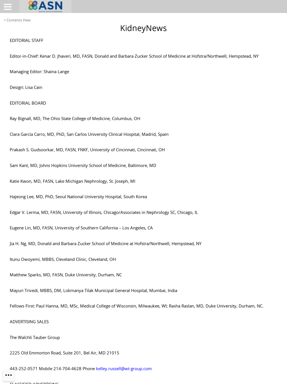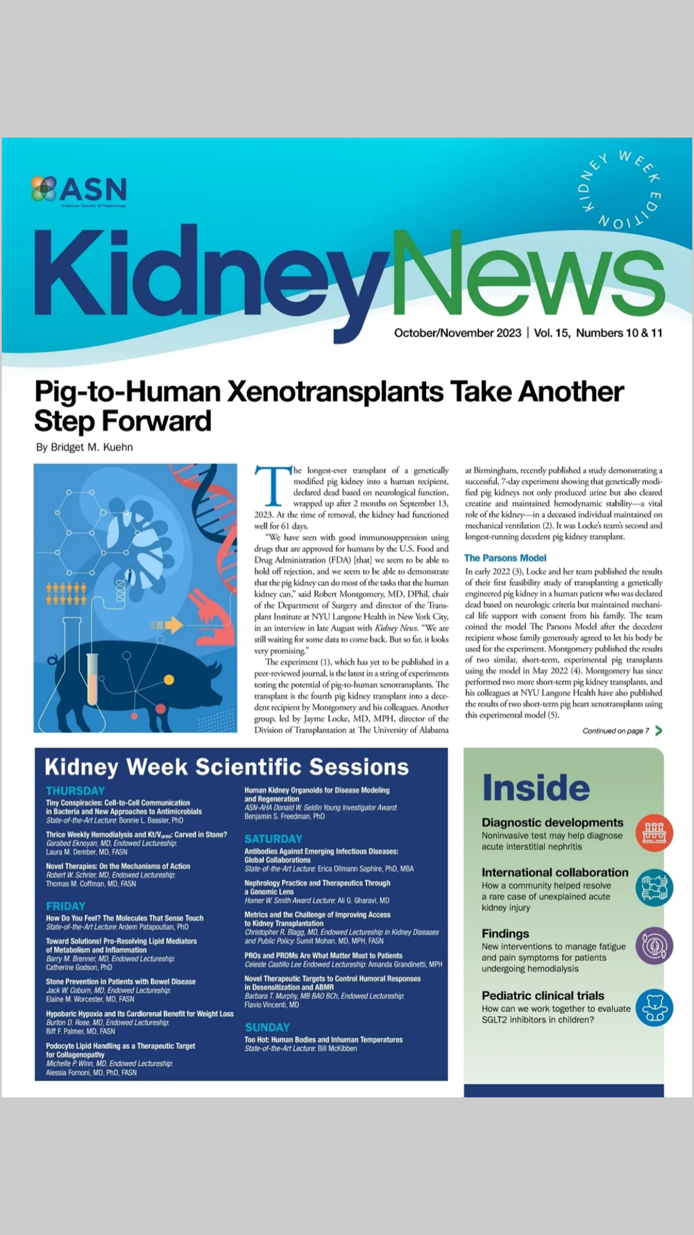ASN Kidney News is your source for information in the world of nephrology. The news magazine examines research findings and policy changes, pinpointing emerging trends in industry, medicine, and training that impact practitioners in kidney health and disease. ASN Kidney News will provide a venue to expound upon scientific and clinical advances, with more commentary and speculation than a scientific journal can allow.