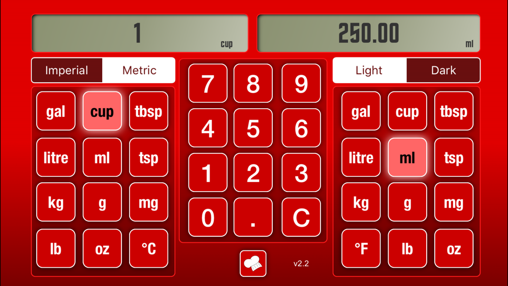 Converting from 11 different weights and volume measurements, the easy to use CookCalc gives you instant answers to your conversion questions!