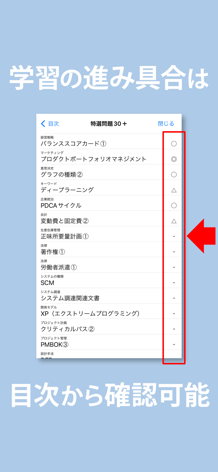 Additionally, results will be displayed on the table of contents. You will find your weak points at a glance. This feature support you to conquer your weakness. Let's get basic knowledge for the certification, and conquer your weak points with this application.