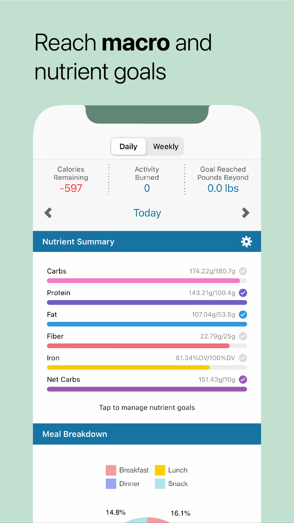 • Daily and Weekly Summary - View charts that give you a breakdown of your food intake and track your macronutrient goals.