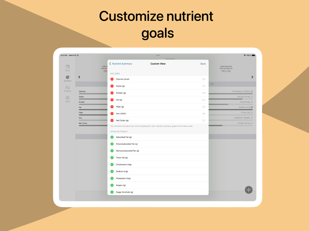 • Custom Nutrient Tracker - 18 Key Nutrients (fiber, sugar, sodium, net carbs, cholesterol, saturated fat, and more)