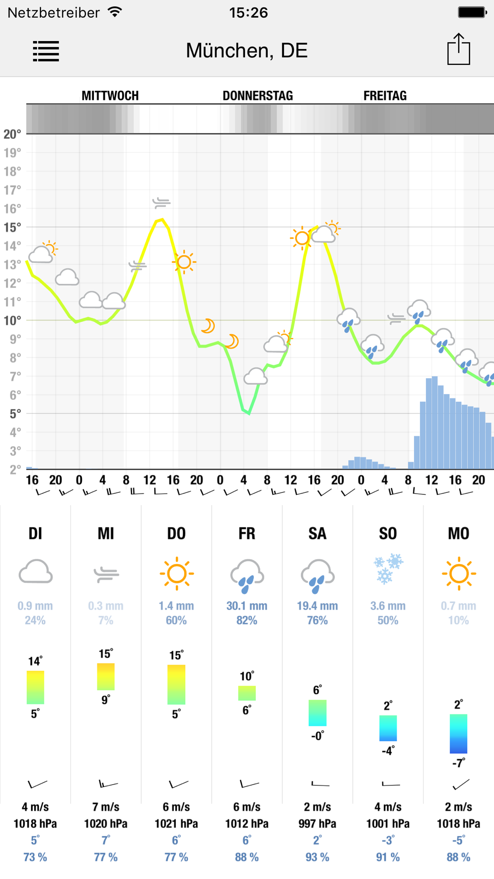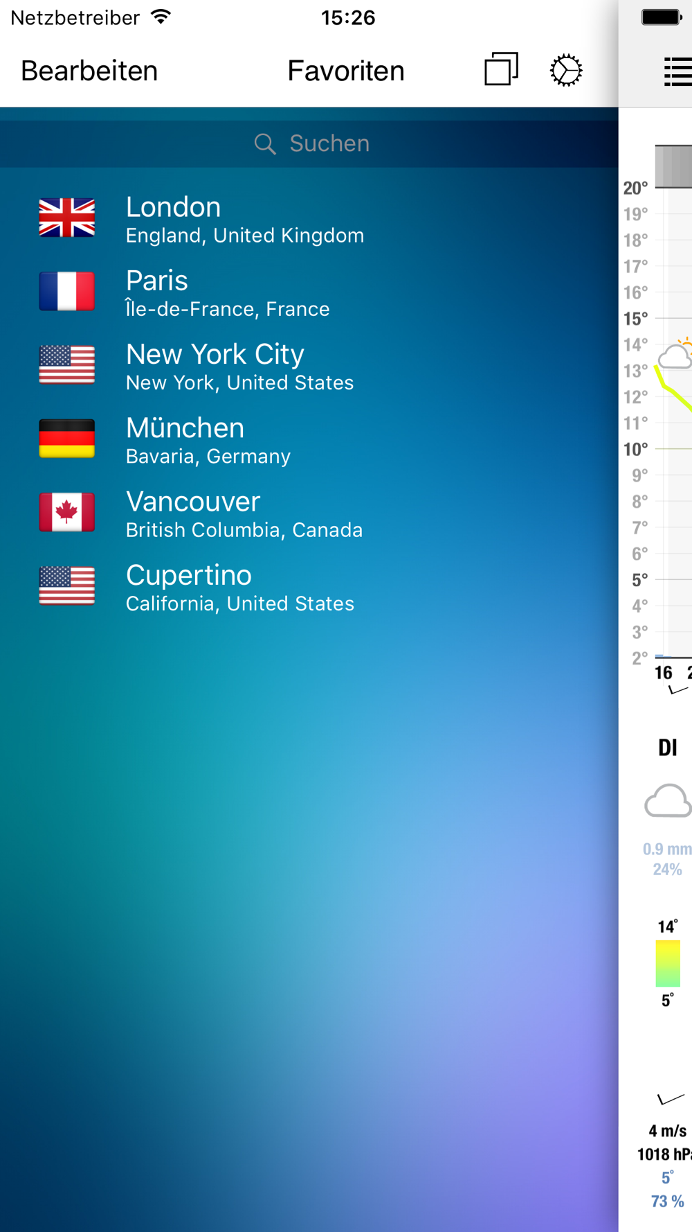 Ein Pop-Up-Menü macht die Nutzung besonders einfach: Werte müssen nicht mehr auf der vertikalen oder horizontalen Achse der Grafik abgelesen werden, sondern man "tippt" irgendwo in das Schaubild und detailliertere Informationen erscheinen. Mit der Meteogram App können Sie Daten für Ihren momentanen Aufenthaltsort erhalten oder Sie wählen einen Ort aus der Datenbank, die über 120.000 Städte weltweit umfasst.