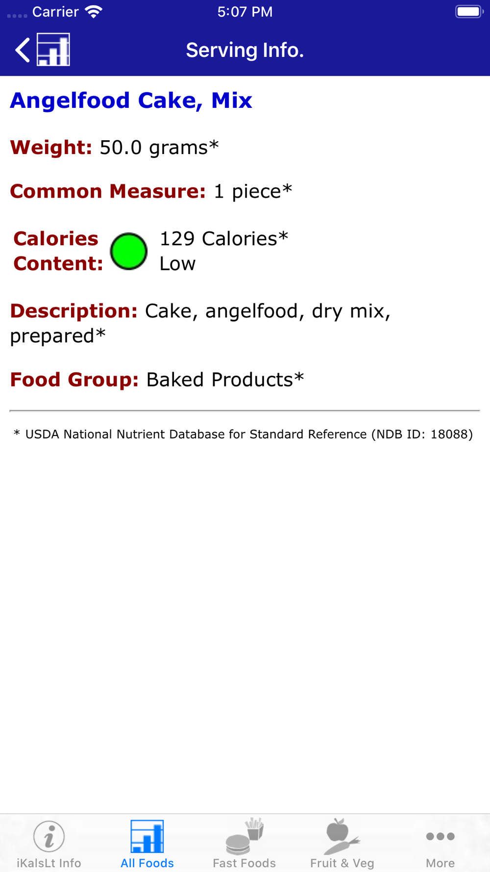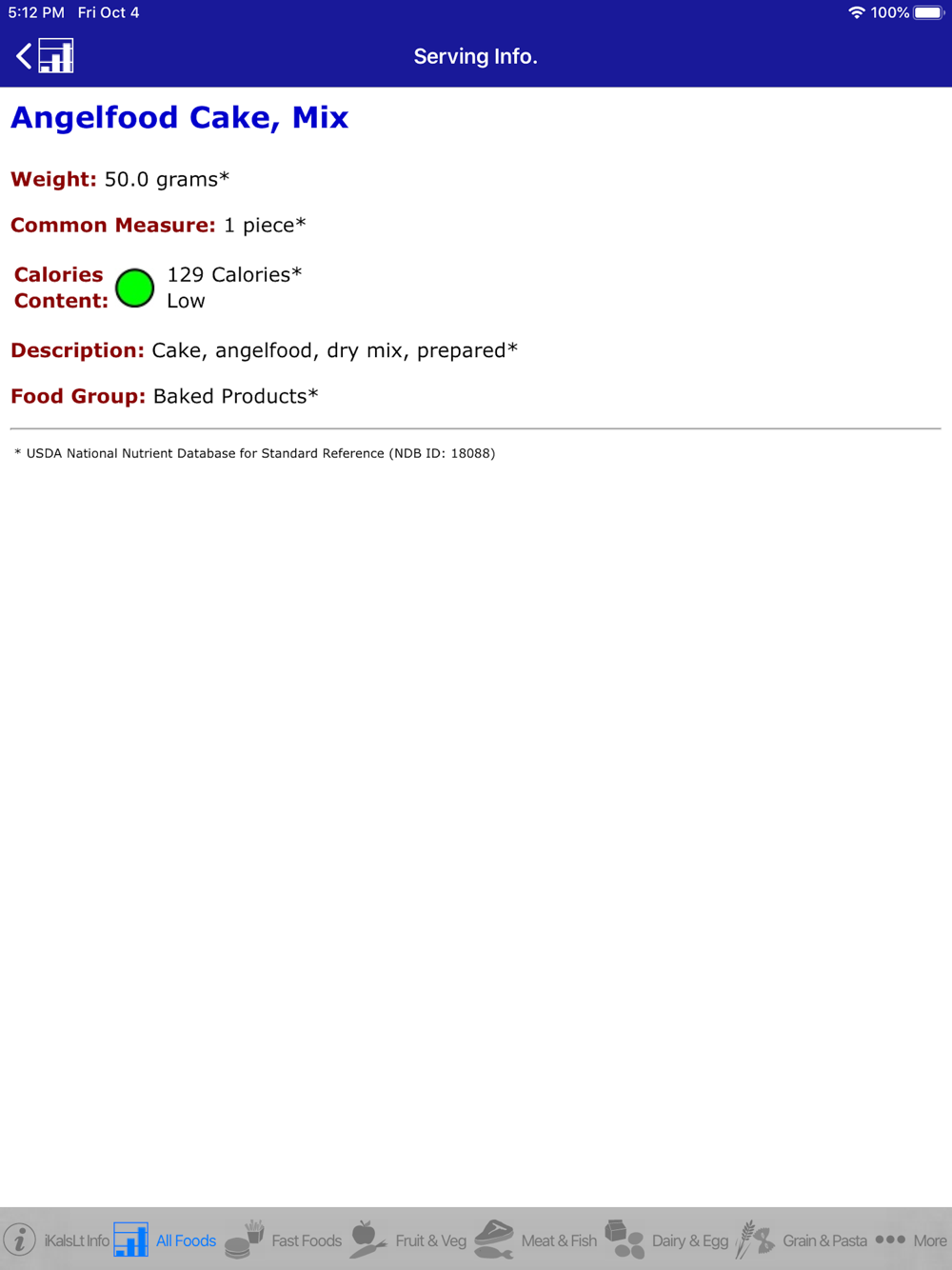 Information is derived from the USDA National Nutrient Database for Standard Reference: Energy (kcal) Content of Selected Foods per Common Measure. There are currently over 1,100 different food servings included, searchable using more than 2,500 names (some foods are known by different names or how they are prepared, e.g., "Egg, Scrambles" and "Scrambled Egg"). A few these have as many as six searchable names.