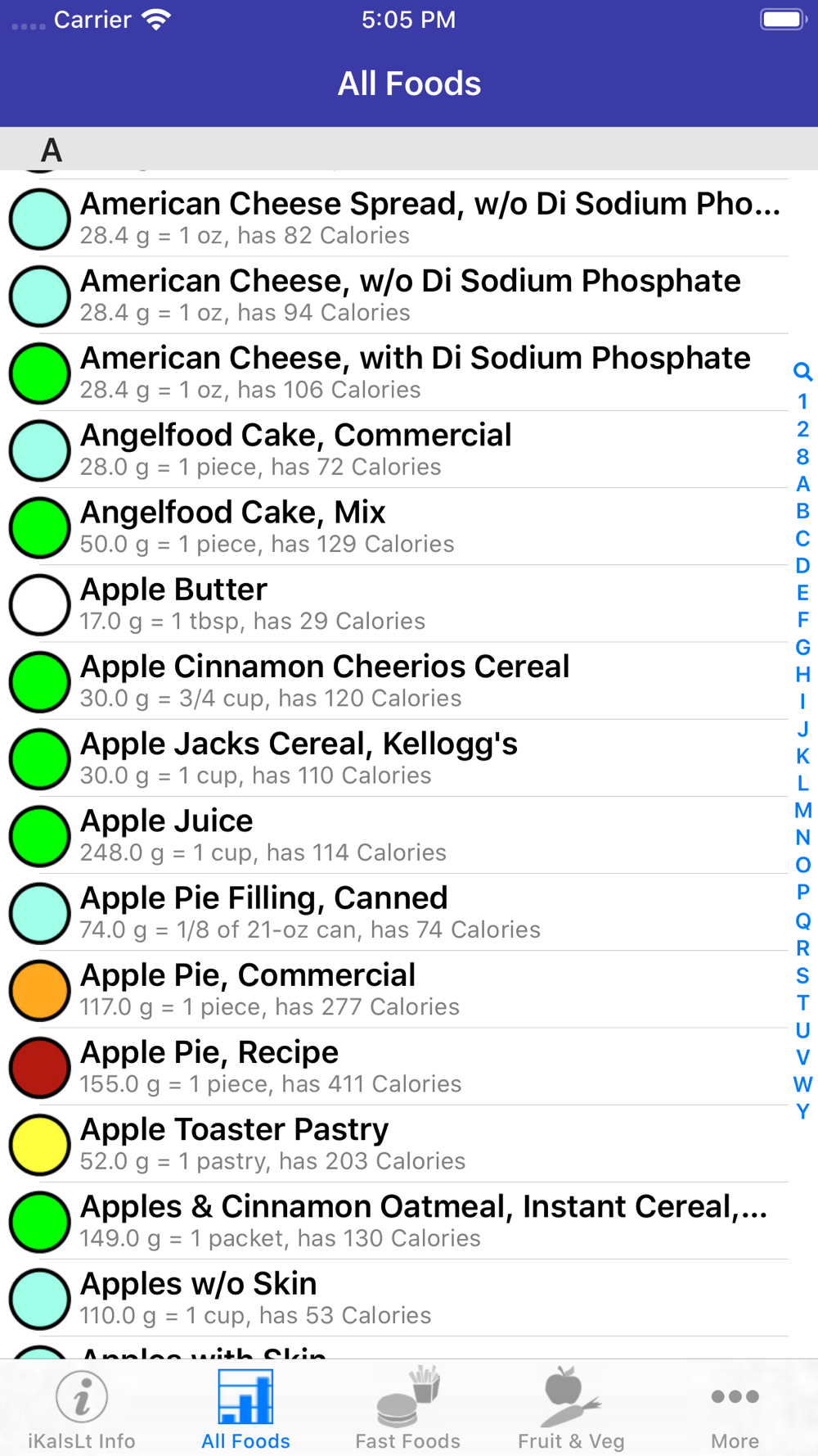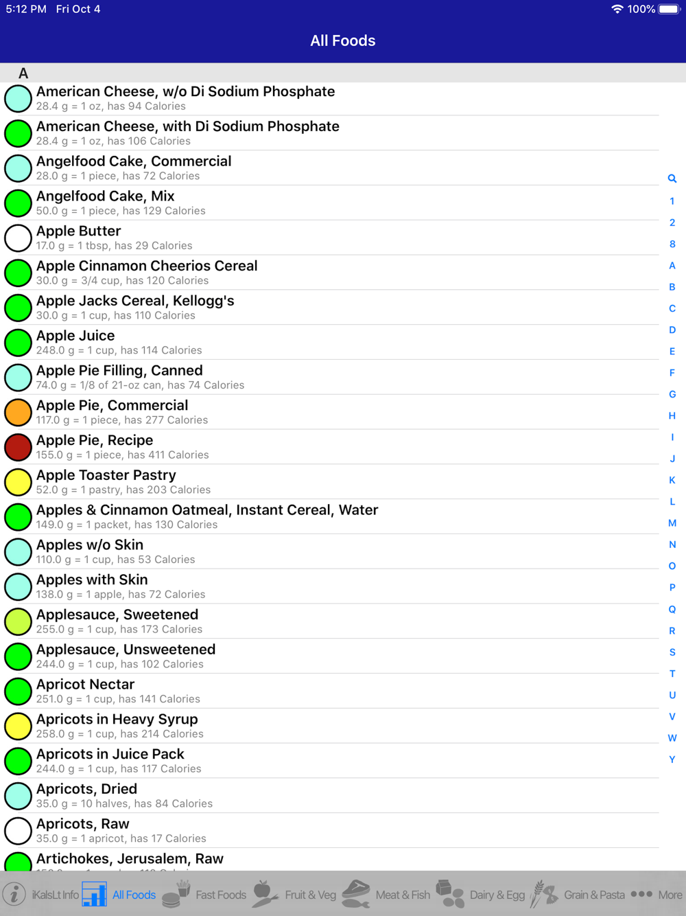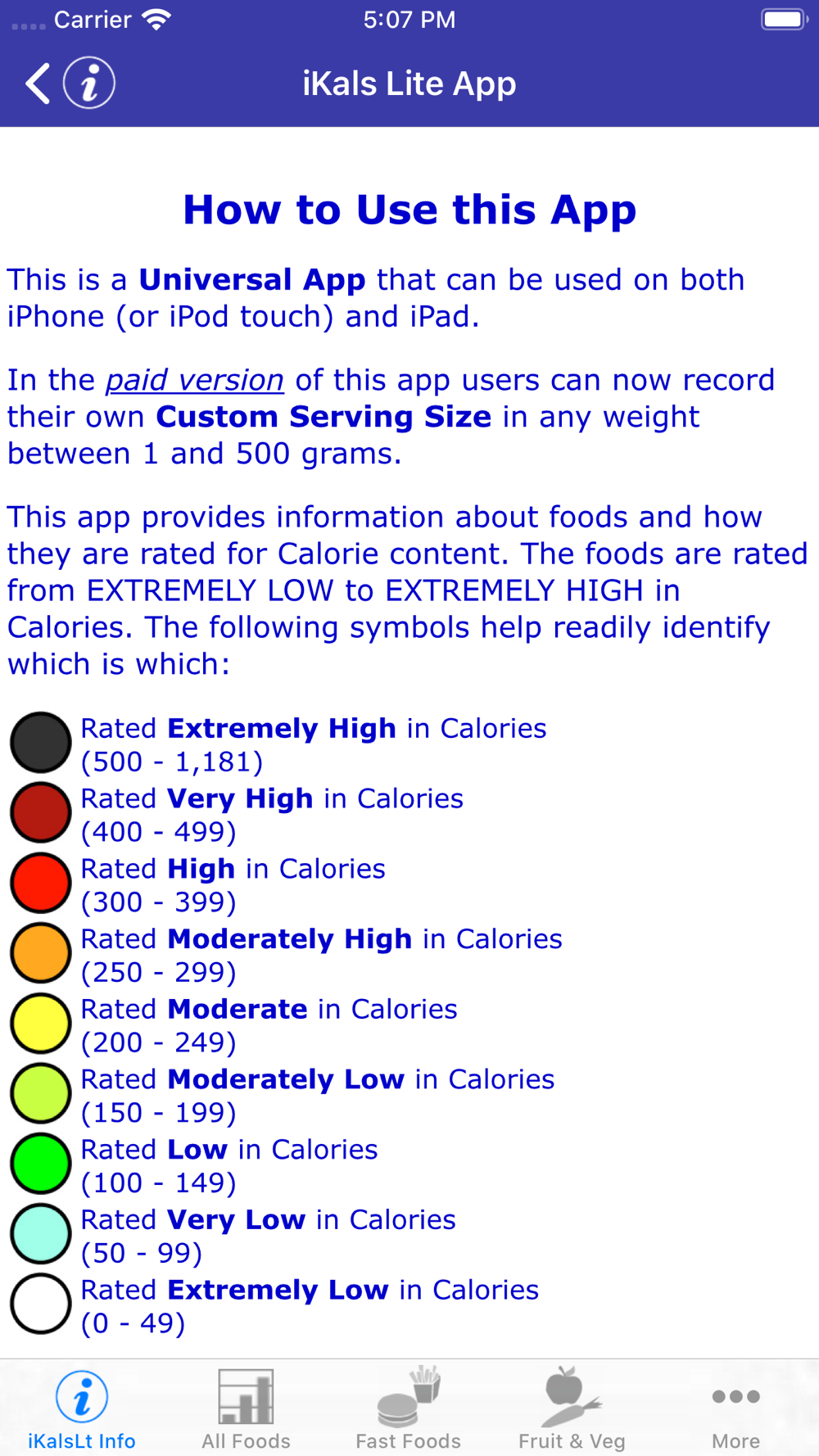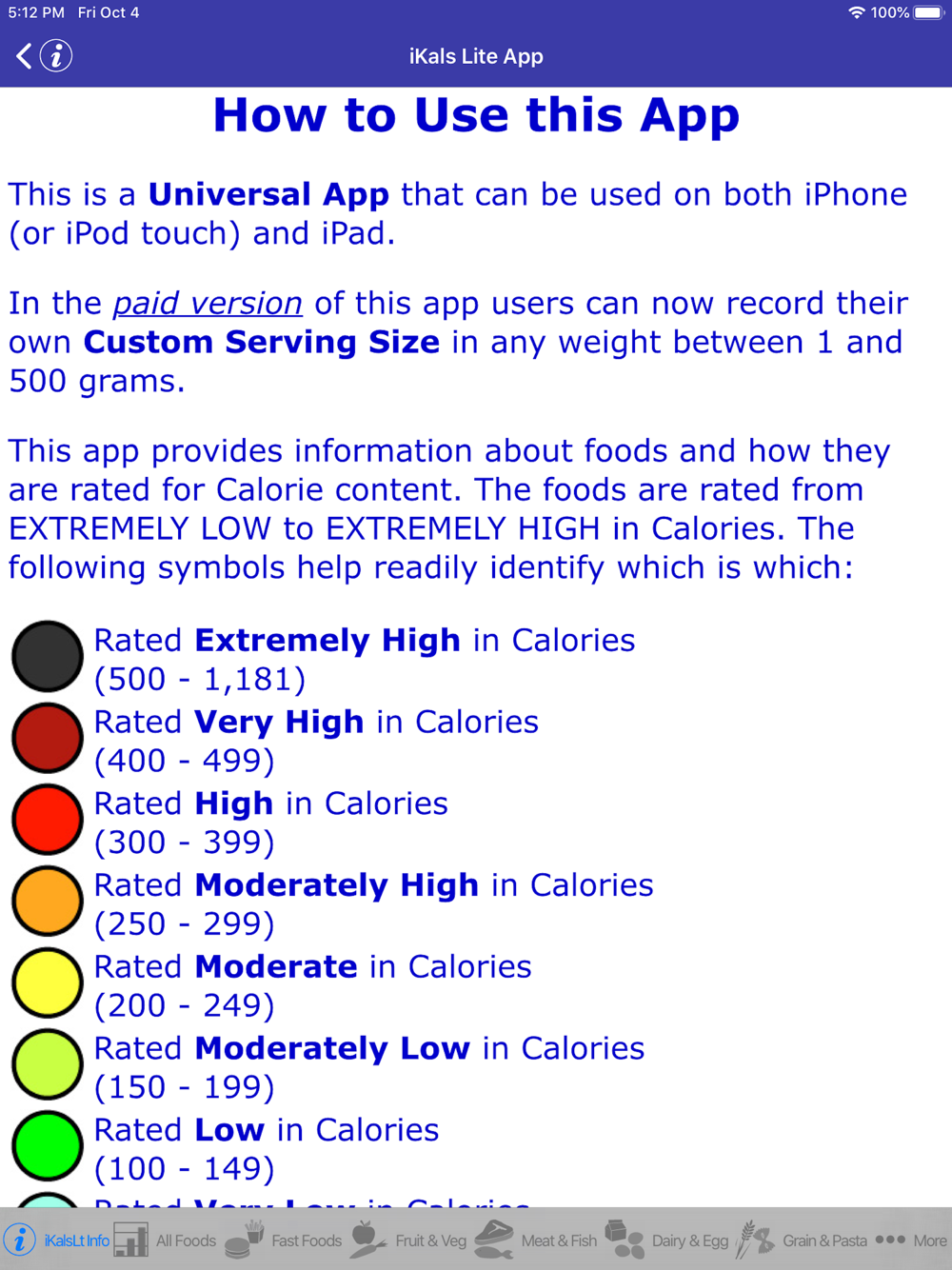 The iKals app provides information about foods and how they are rated for Calorie content. This is provided as a means to assist in deciding which foods to eat. The food servings are rated from EXTREMELY LOW in Calories all the way up to EXTREMELY HIGH. The following colors help readily identify which is which: