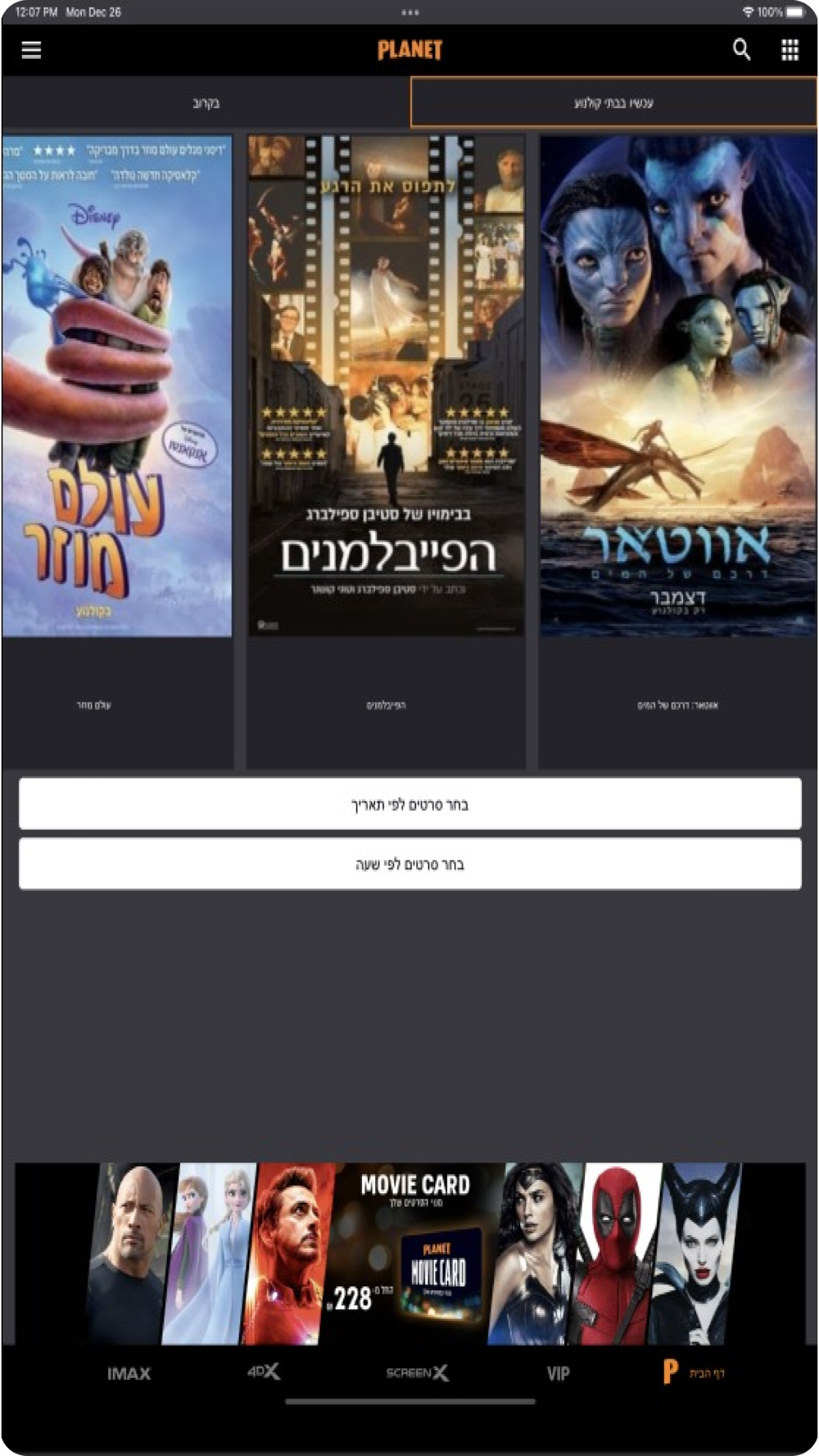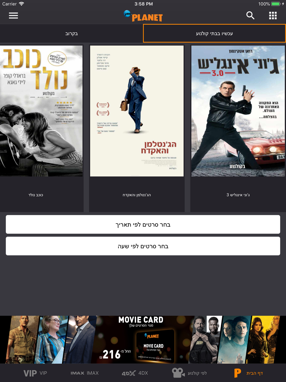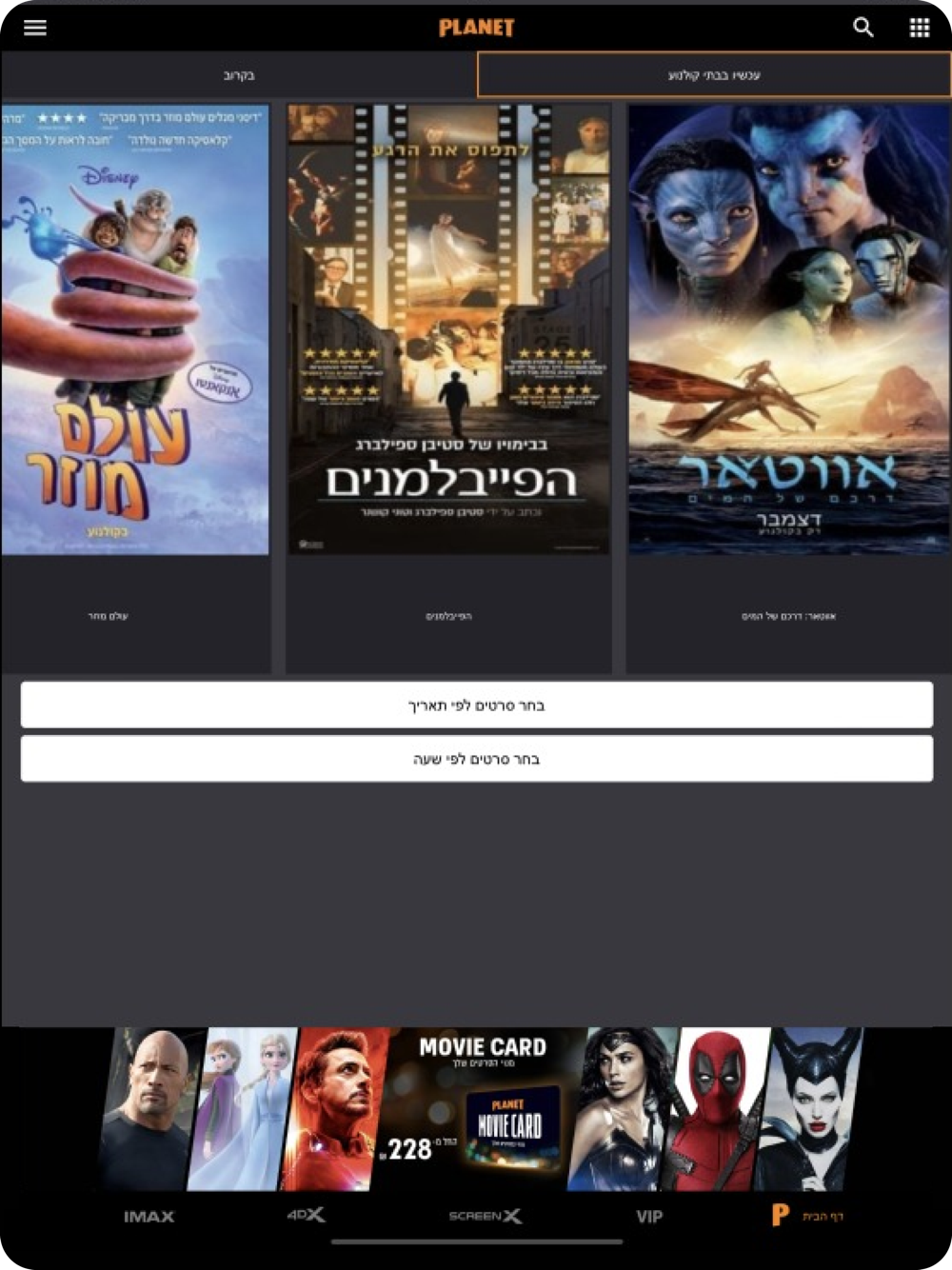 זמני ההקרנות לכל סרט מוצגים לפי קולנוע ולפי תאריך, וניתן לסנן לפי פורמט הקרנה, ז'אנר, סרטים מדובבים ועוד, או לבחור את האולמות המיוחדים המועדפים עליכם – IMAX, DX4 או VIP.
