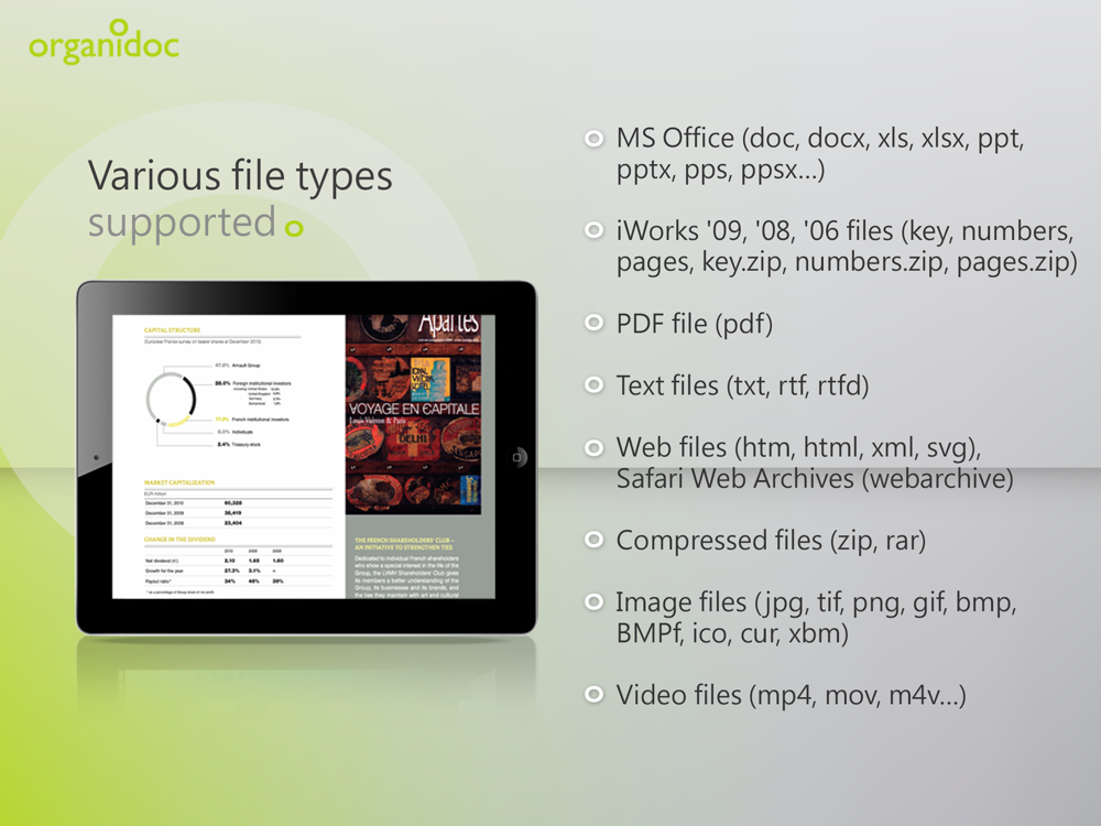 • Browsing the majority of file formats on your iPad with the formats listed below: