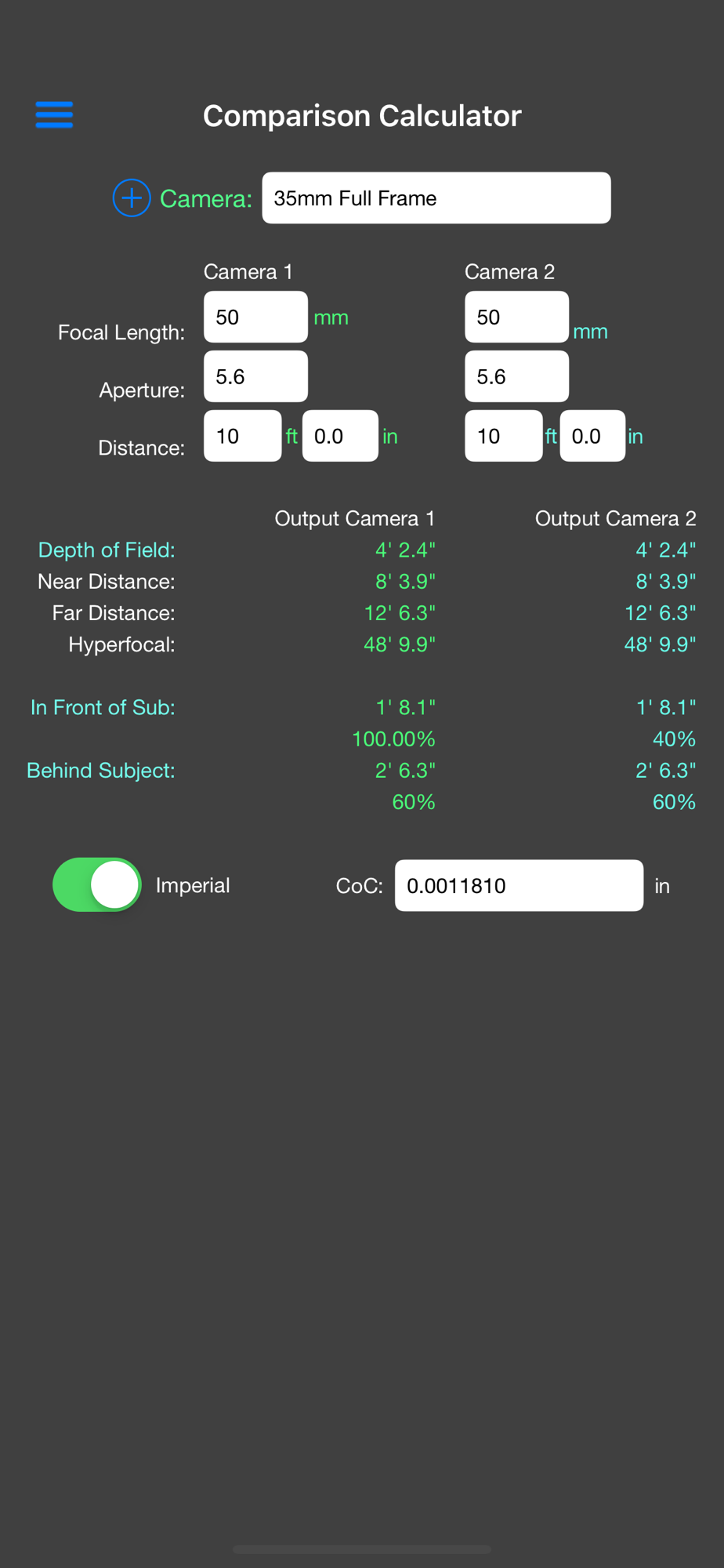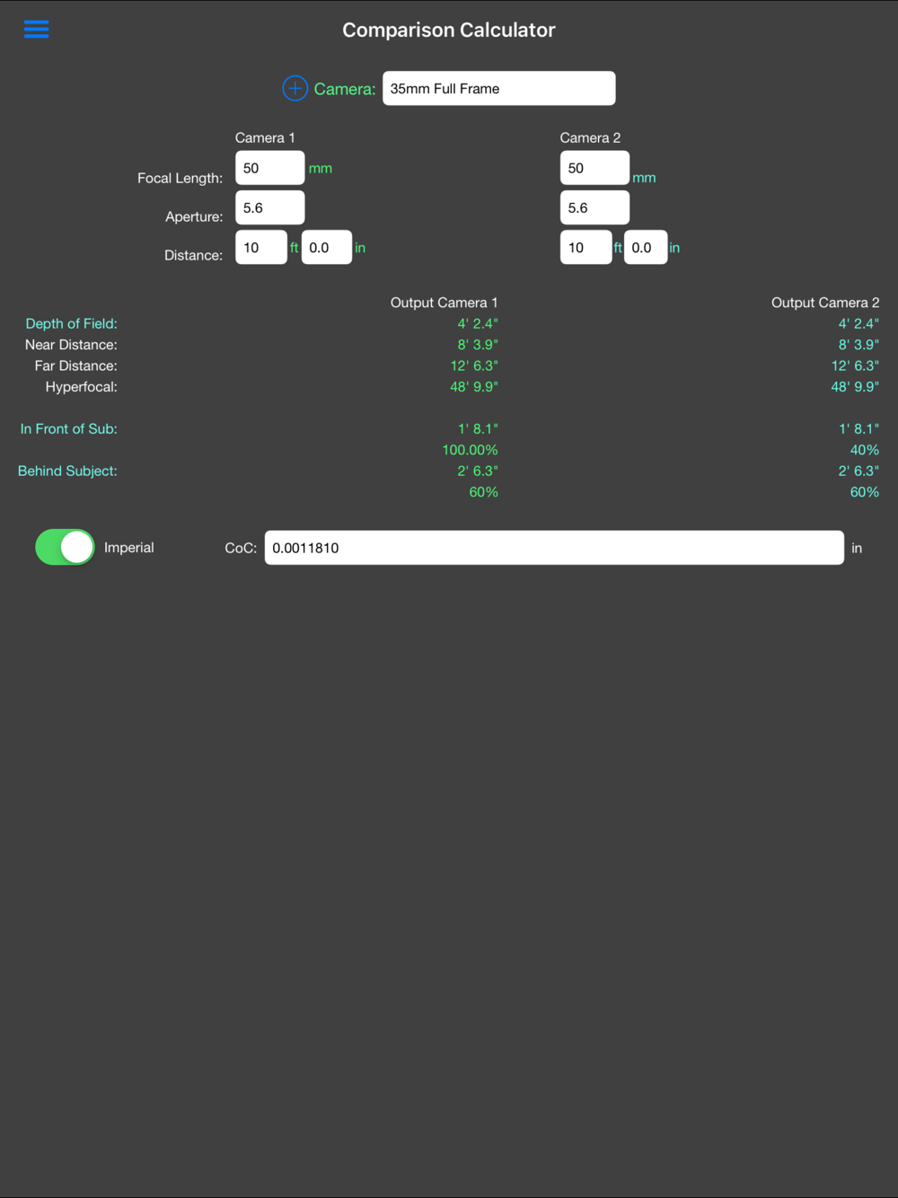 An easy to use highly customizable Depth of Field Calculator for cinematographer’s and photographer’s. Lots of cameras to choose from. Now even better, the current version allows users to save their camera settings and view all in app purchases.