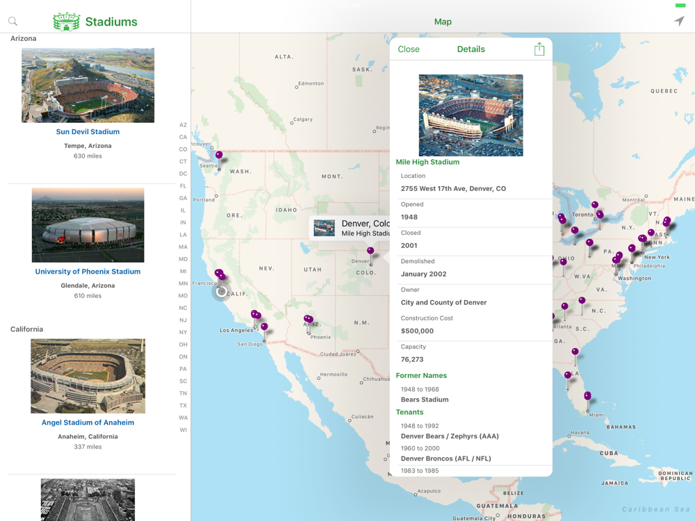 This app. provides a handy pocket reference guide for the stadiums, past and present, that hosted professional football games.