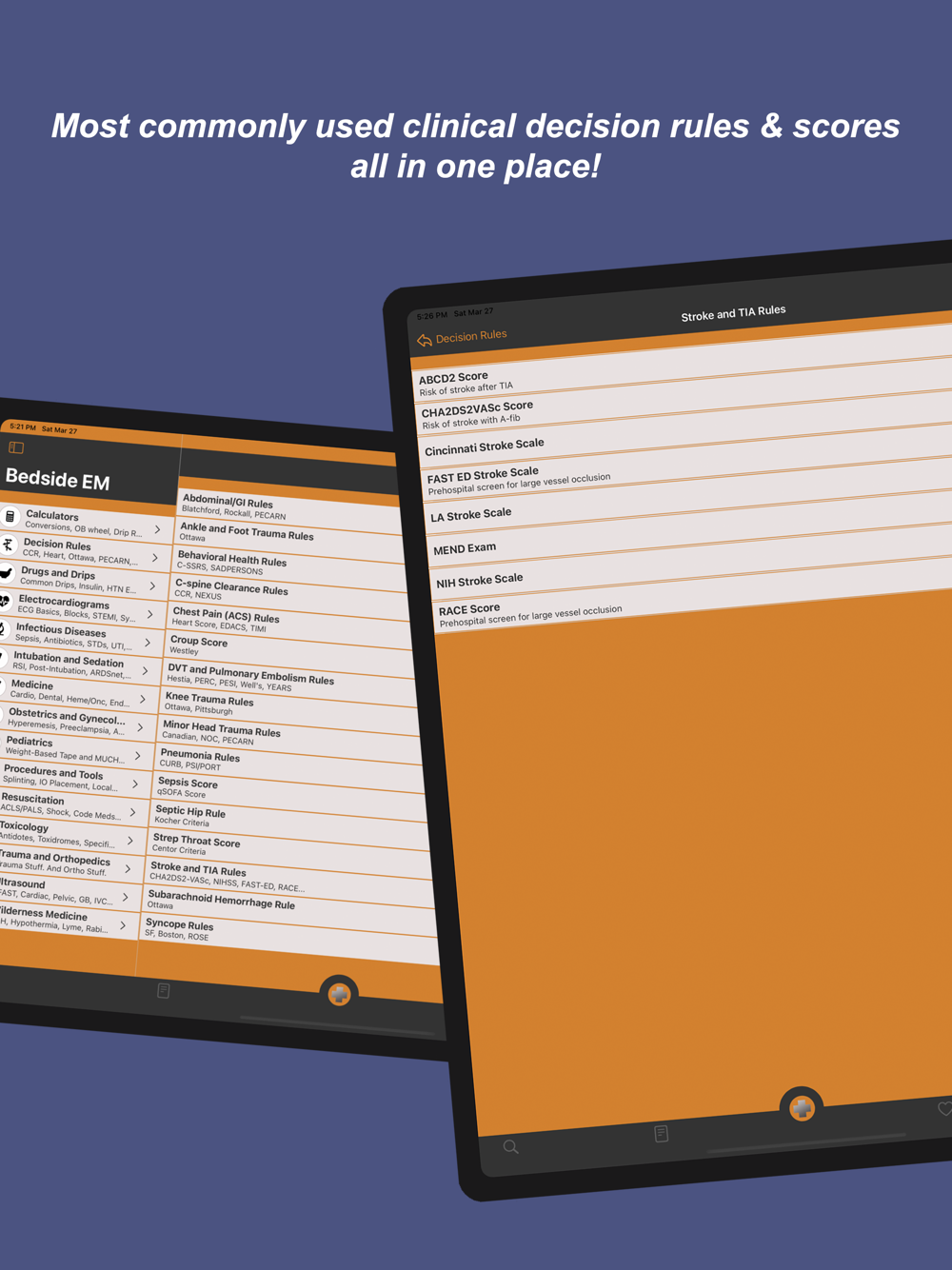 Bedside EM is an easy-to-navigate tool containing the various medication lists, algorithms, decision rules, clinical policies and core content most often looked up by emergency care providers during shifts.