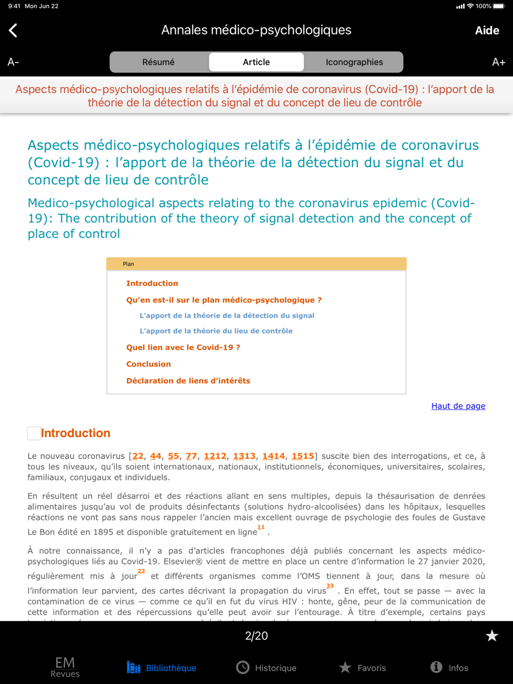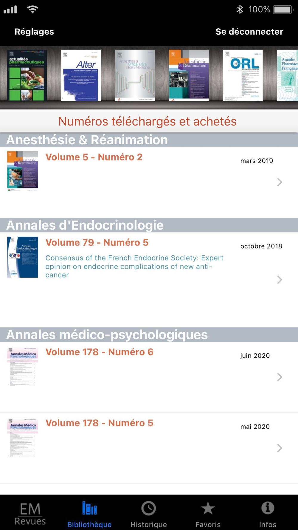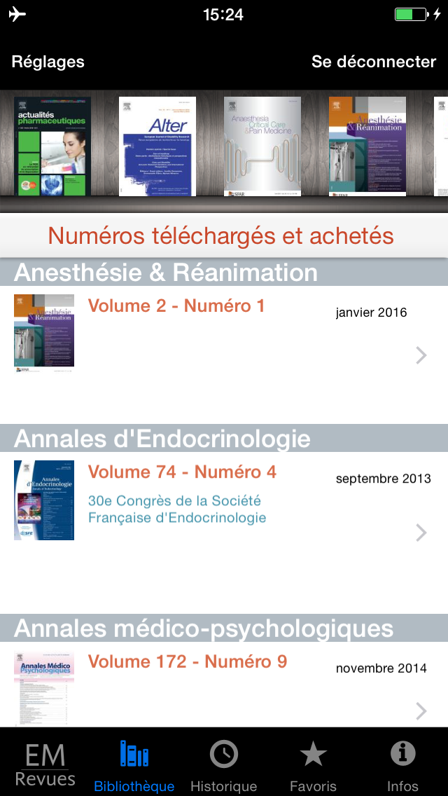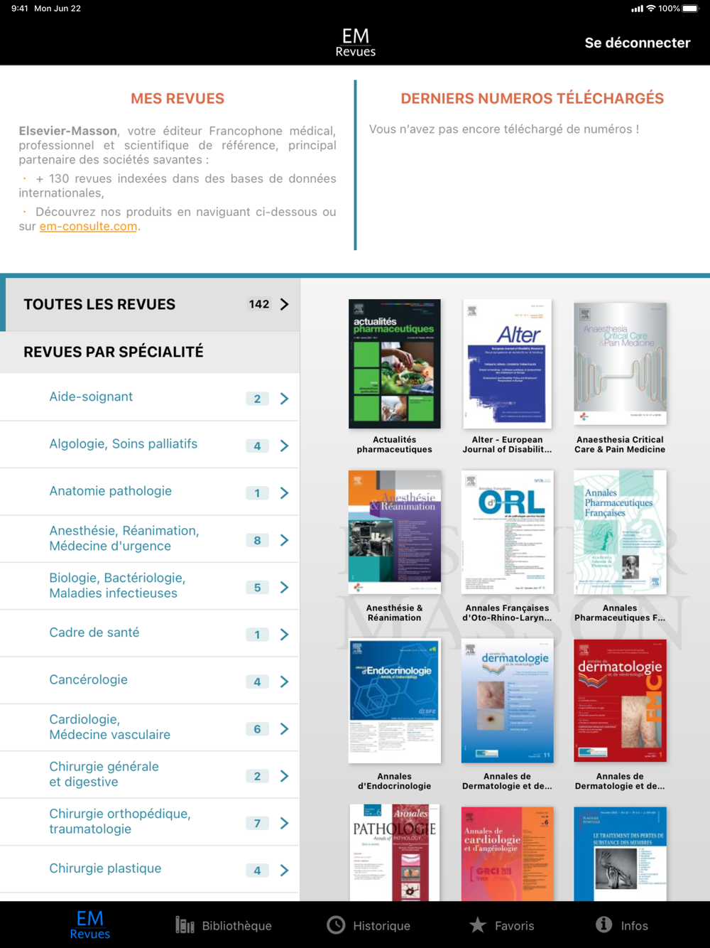 Les revues actuellement disponibles dans l’application iPad/iPhone : Annales de cardiologie et d'angéiologie ; Annales de chirurgie plastique esthétique ; Annales de Dermatologie et de Vénéréologie ; Annales de Pathologie ; Annales d'Endocrinologie ; Annales françaises d'anesthésie et de réanimation ; Annales Pharmaceutiques Françaises ; Annals of Physical and Rehabilitation Medicine ; Antibiotiques ; Archives de pédiatrie ; Archives of cardiovascular diseases ; Cancer / Radiothérapie ; Chirurgie de la main ; Diabetes & Metabolism ; Douleurs ; European Annals of Otorhinolaryngology, Head and Neck Diseases ; Gynécologie Obstétrique & Fertilité ; Joint Bone Spine ; Journal de Chirurgie Viscérale ; Journal de Gynécologie Obstétrique et Biologie de la Reproduction ; Journal de pédiatrie et de puériculture ; Journal Français d'Ophtalmologie ; La Presse Médicale ; La revue de médecine interne ; La revue Sage-femme ; Le praticien en anesthésie réanimation ; L'Encéphale ; Médecine et Maladies Infectieuses ; Médecine Nucléaire ; Médecine palliative ; Néphrologie & Thérapeutique ; Neuropsychiatrie de l'Enfance et de l'adolescence ; Nutrition clinique et métabolisme ; Pratique neurologique – FMC ; Progrès en Urologie ; Progrès en urologie-FMC ; Revue de Chirurgie Orthopédique et Traumatologique ; Revue d'Epidémiologie et de Santé Publique ; Revue du rhumatisme ; Revue Française d'Allergologie ; Revue Neurologique ; Science & Sports ; Sexologies.