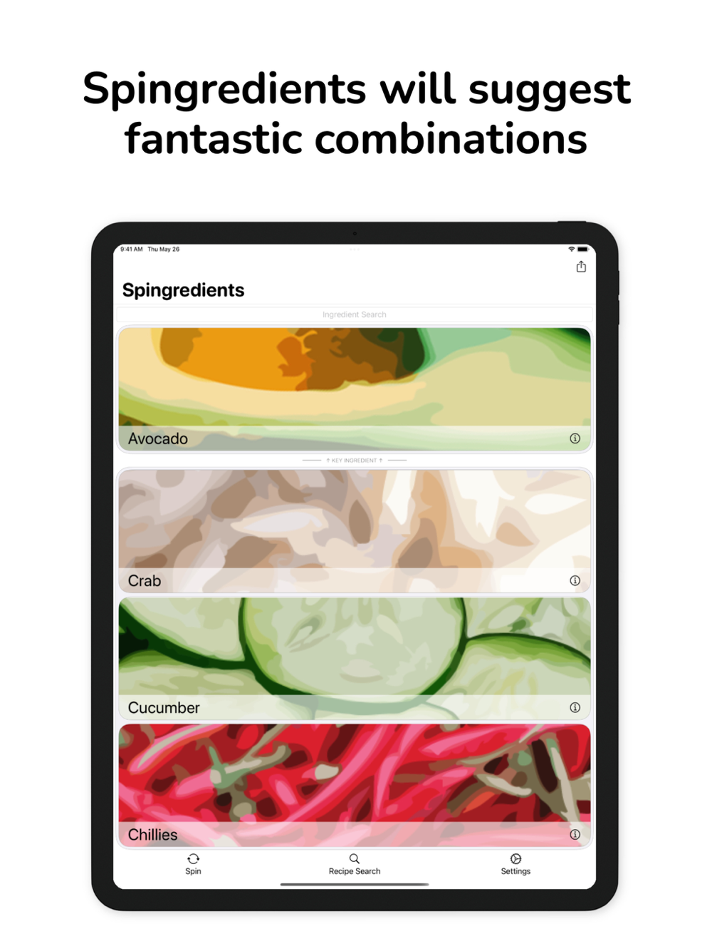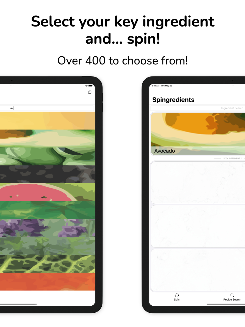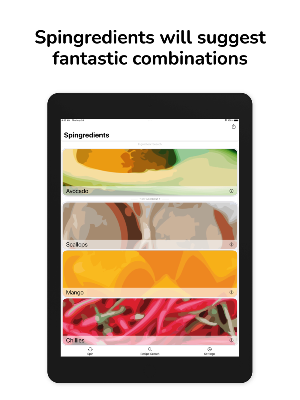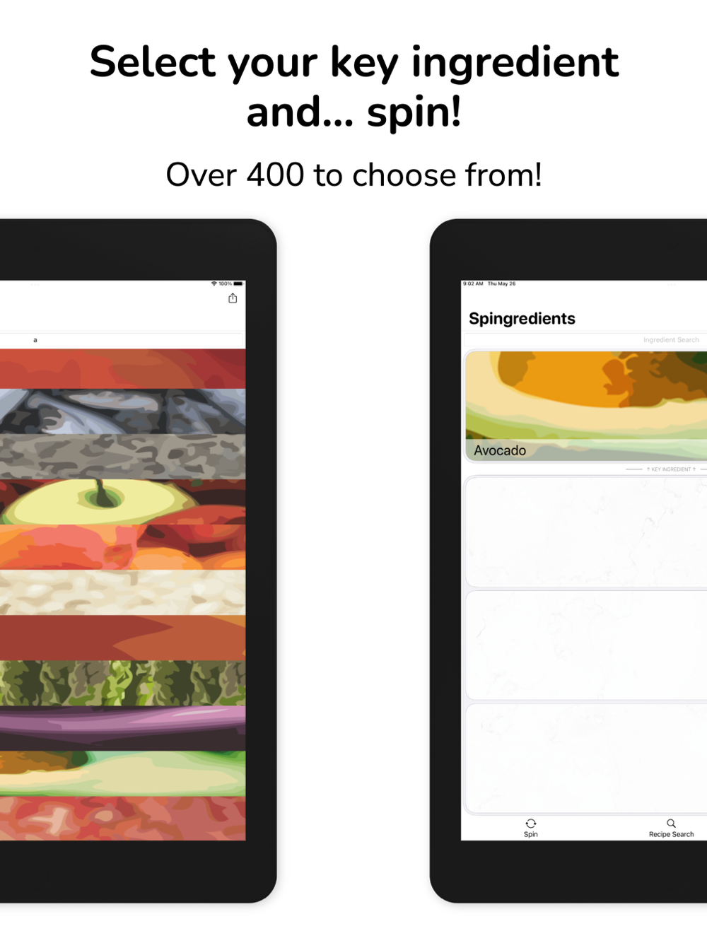 Plan your meal around a staple, shake or swipe to start the spinner, and Spingredients serves up a clean, colorful display of the four basic ingredients you need to create your dish."