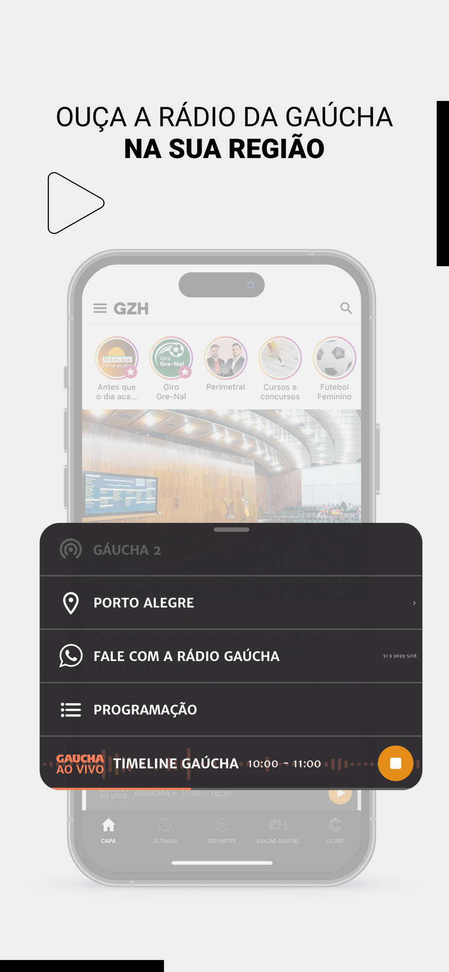 Escute a Rádio Gaúcha enquanto navega pelo aplicativo. O app permite ouvir o canal Gaúcha 2 e também sintonizar a programação de diferentes regiões (Porto Alegre, Serra, Santa Maria e Sul do RS).