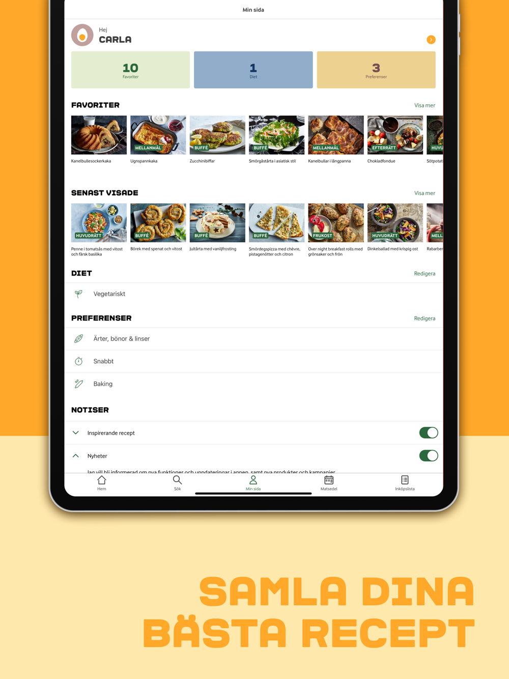 • 6 matsedlar från Arla Mat varje vecka (Dagens,Vegetariskt, Snabb, GI, Smalt, Budget)