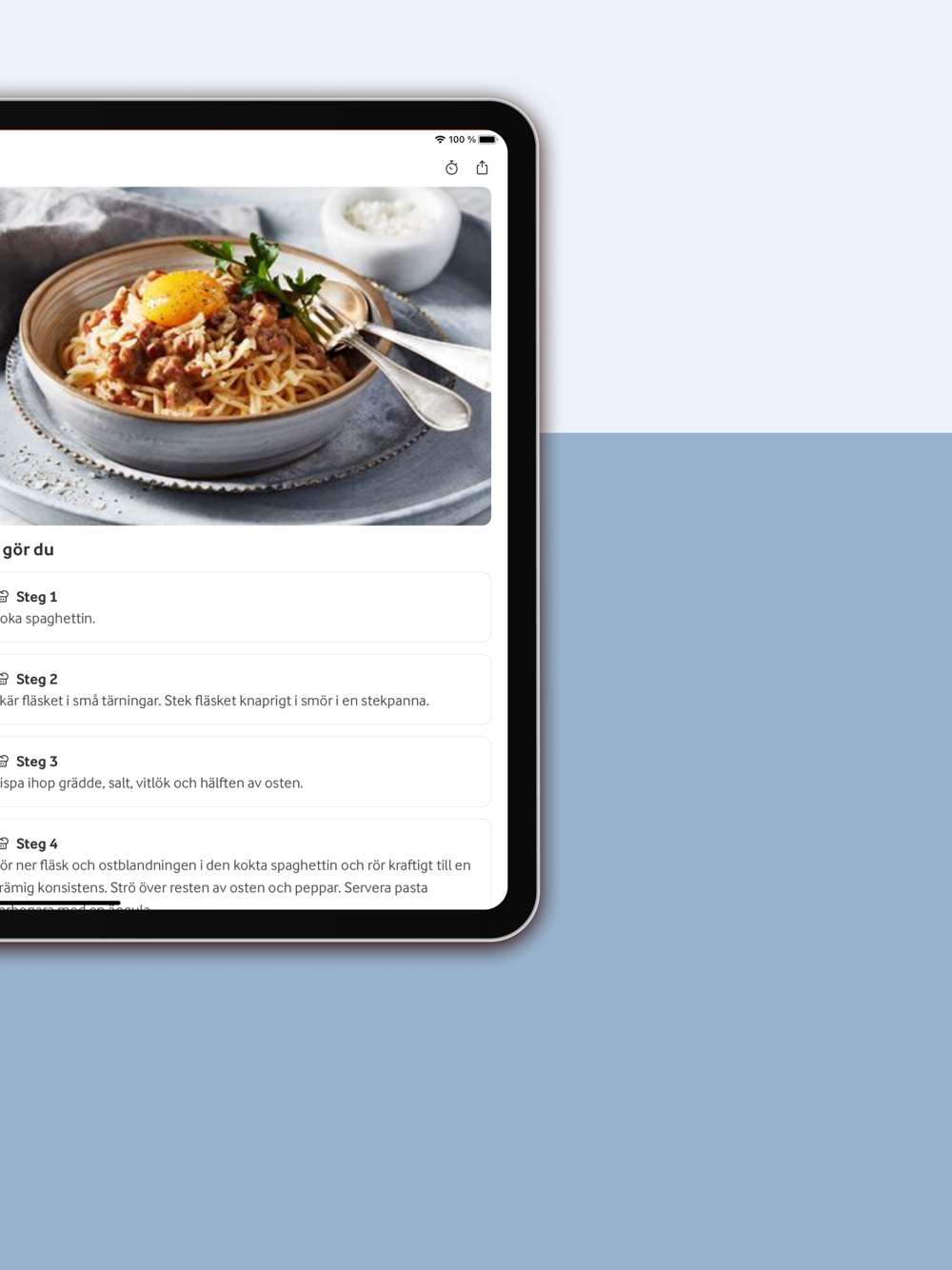 Frukost, lunch, brunch, förrätt, middag eller dessert? Lågt fett, snabbt eller vegetariskt recept? Appen har något för alla. Sök efter en specifik ingrediens eller namnet på en maträtt och välj bland de många populära recepten. Du kan också hitta inspiration i våra många teman - till exempel till din studentfest, grillkväll, julmiddag, födelsedag, konfirmation eller nyårsmeny. Eller så kan du inspireras av nya rätter med de bästa säsongsbetonade ingredienserna.