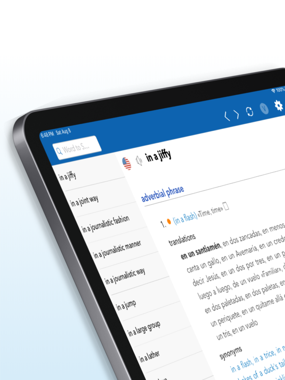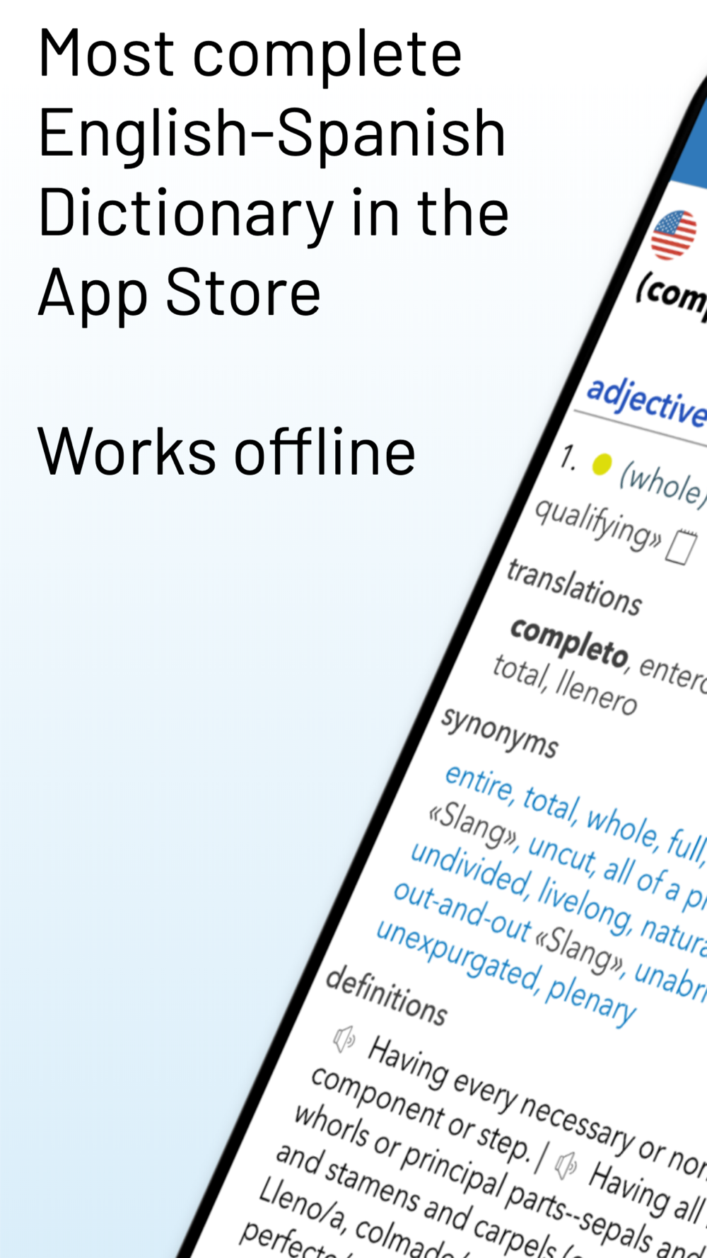 WORKS OFFLINE. By far, the largest Spanish to English and English to Spanish Dictionary App at any price! It includes all our specialized terminology (Legal, Medical, etc.) and natural-sounding voices in a variety of bilingual accents. Featuring a detailed Verb Conjugator, translations with definitions, examples, and quotes; results are easy to review while you navigate in-depth information for each entry.