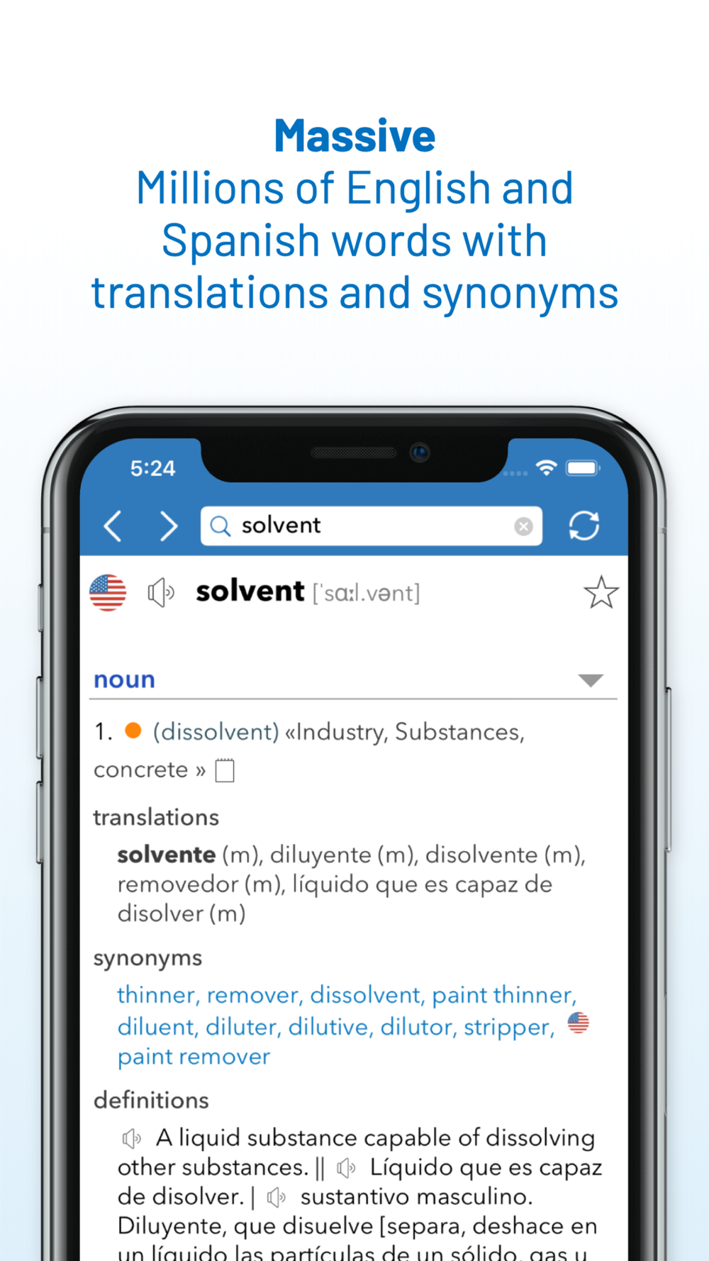 • Natural-sounding voices for entries, definitions and examples in both languages (British and American English, European and American Spanish)