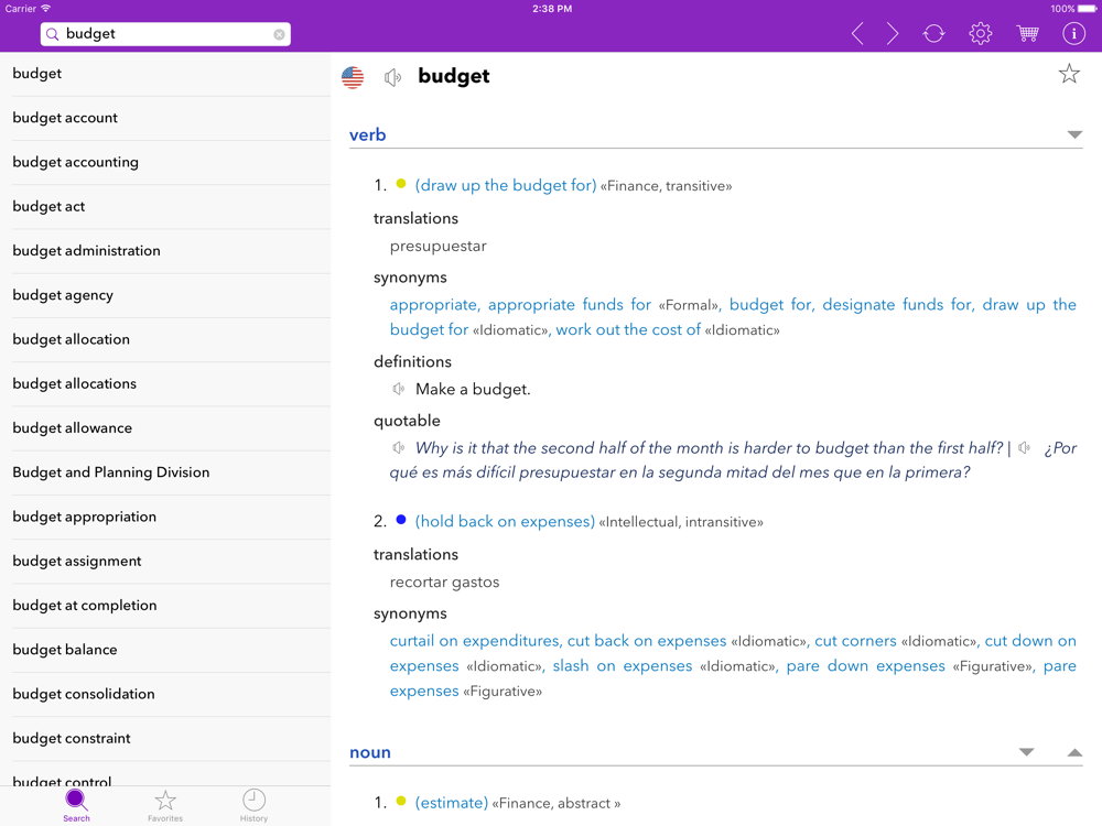 • Natural-sounding voices for entries, definitions and examples in both languages (British and American English, European and American Spanish)