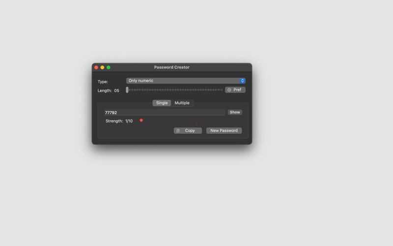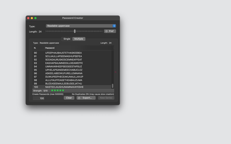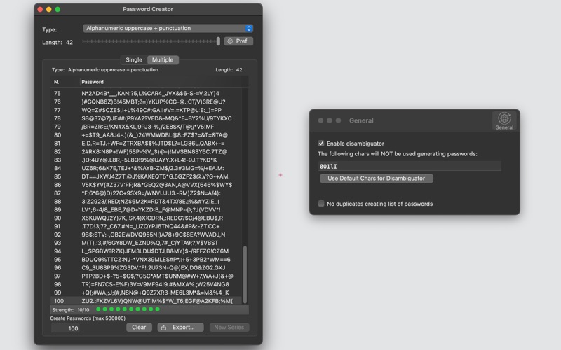 It allows to create a single password or a long list , up to 500000 (half million) of passwords, in a single click, inside an internal table, ready to be saved on disk as text