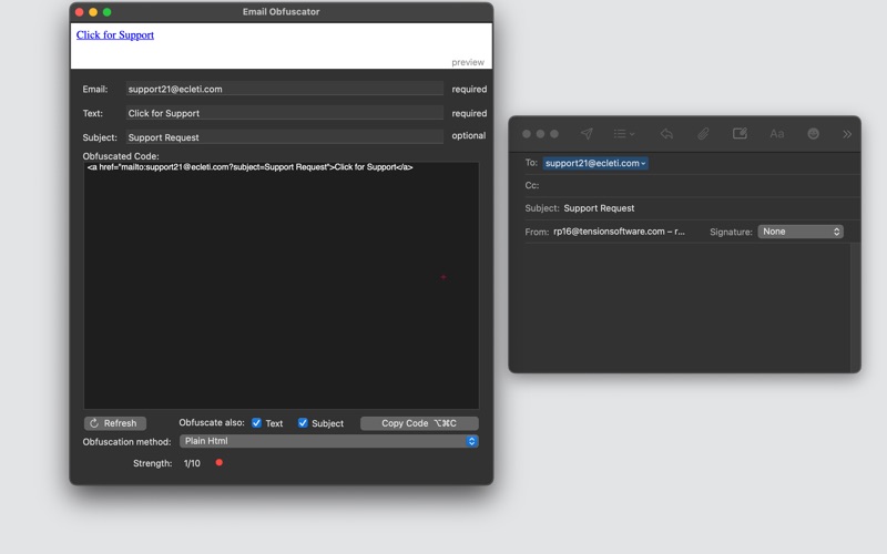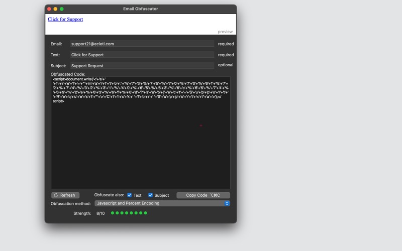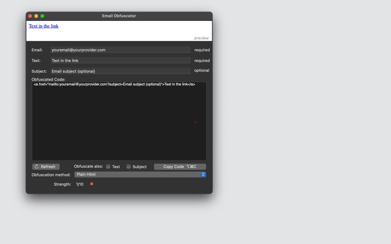 This tool creates email links using obfuscated code, ready to be used on your HTML web pages.