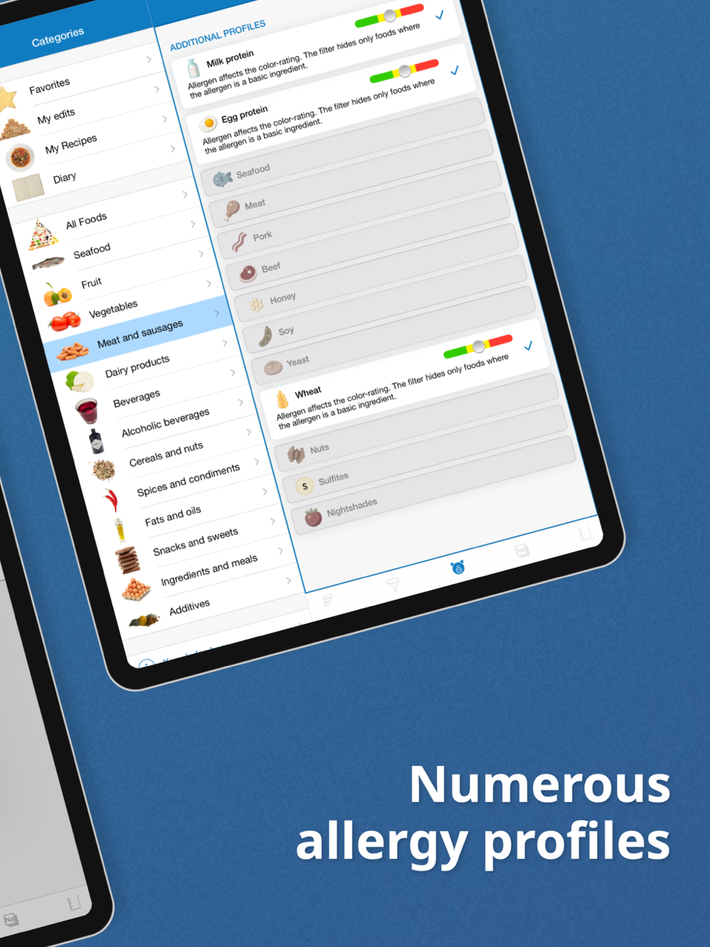 • Additional profiles for gluten, wheat, soy, yeast, sulfites, dairy, egg, fish, meat, pork, beef, honey, treenuts and nightshades