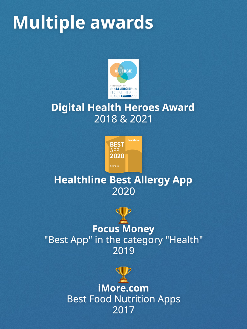Our app has been reviewed by the medical jury of MeinAllergiePortal and was awarded the Digital Health Heroes Award twice.