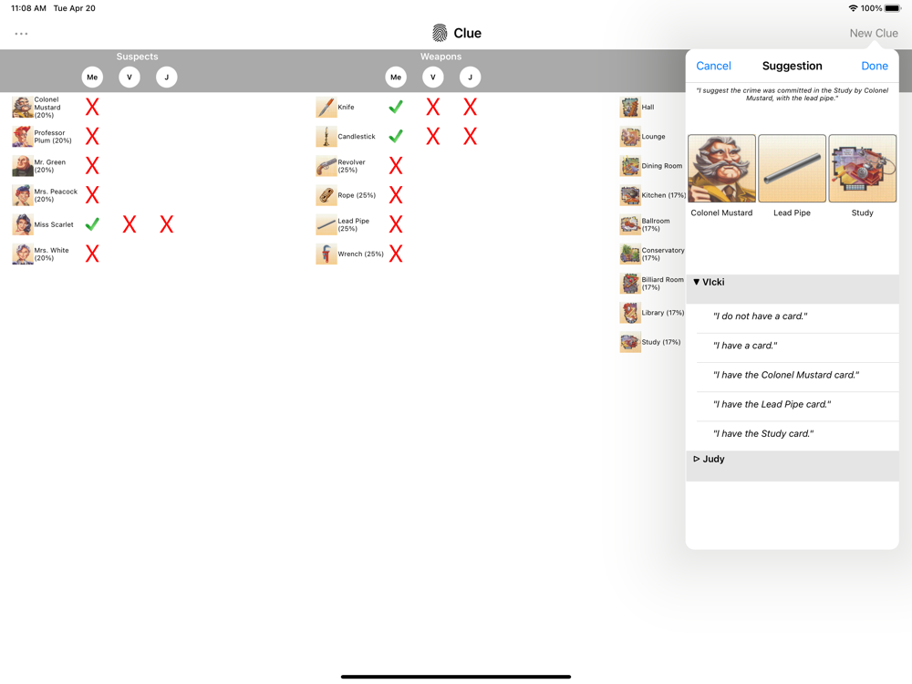 Clue Solver helps you track of every suggestion to quickly solve the crime. The fun, graphical “assistant” helps you speed through solving the mystery.
