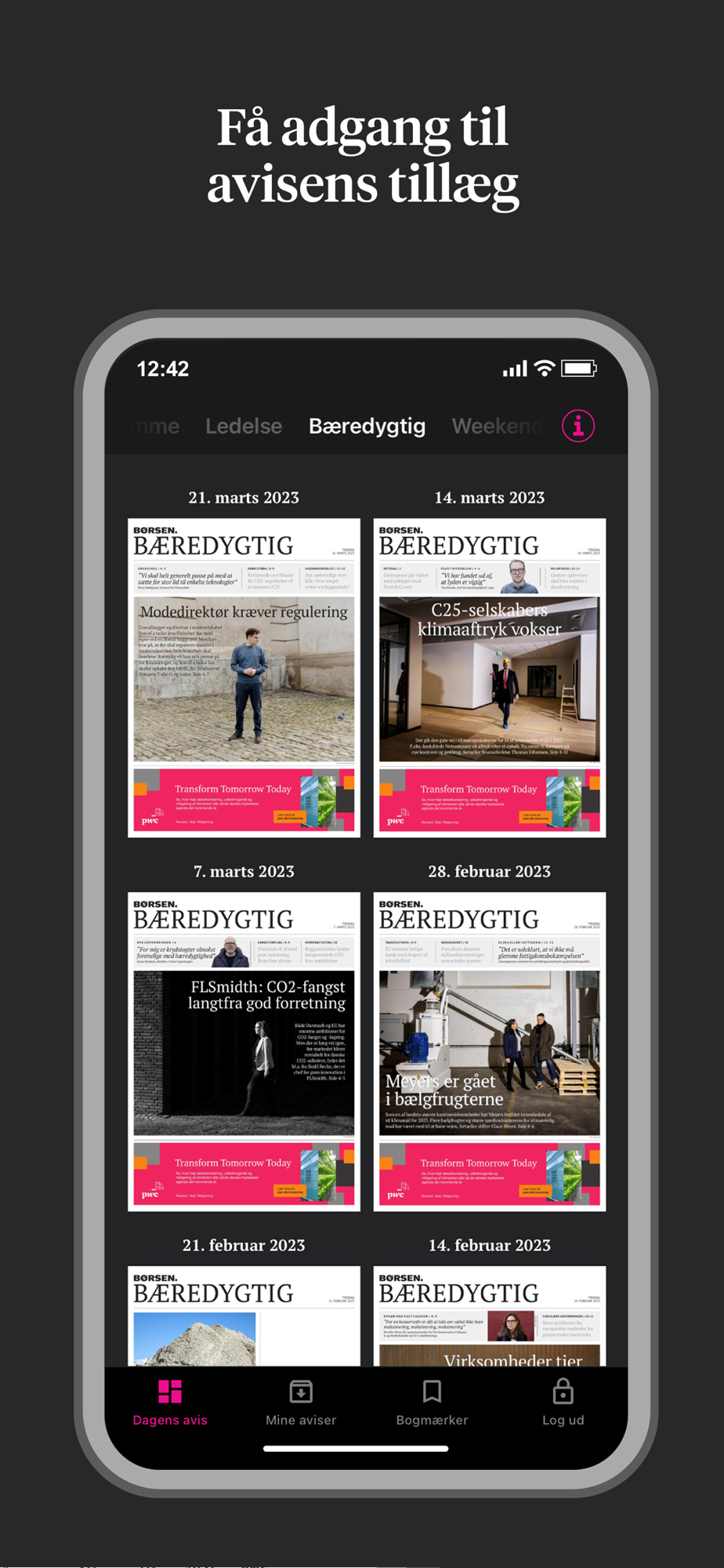 I Børsen e-avisapp får du nemt overblik over tillæg til avisen. Her kan du bl.a. dykke ned i historier om bæredygtighed, ejendomme og ledelse samt læse vores livsstilsmagasin Pleasure.