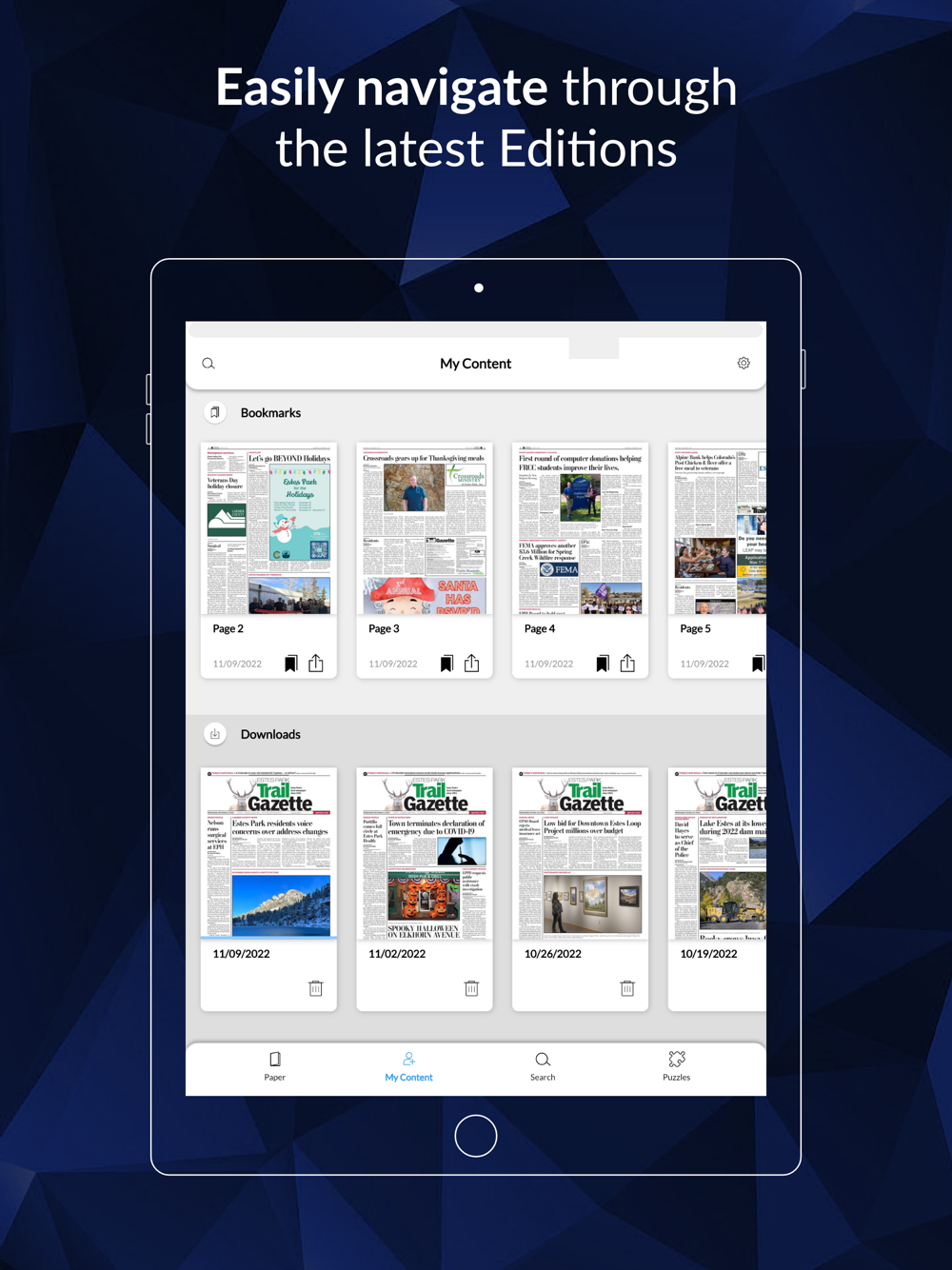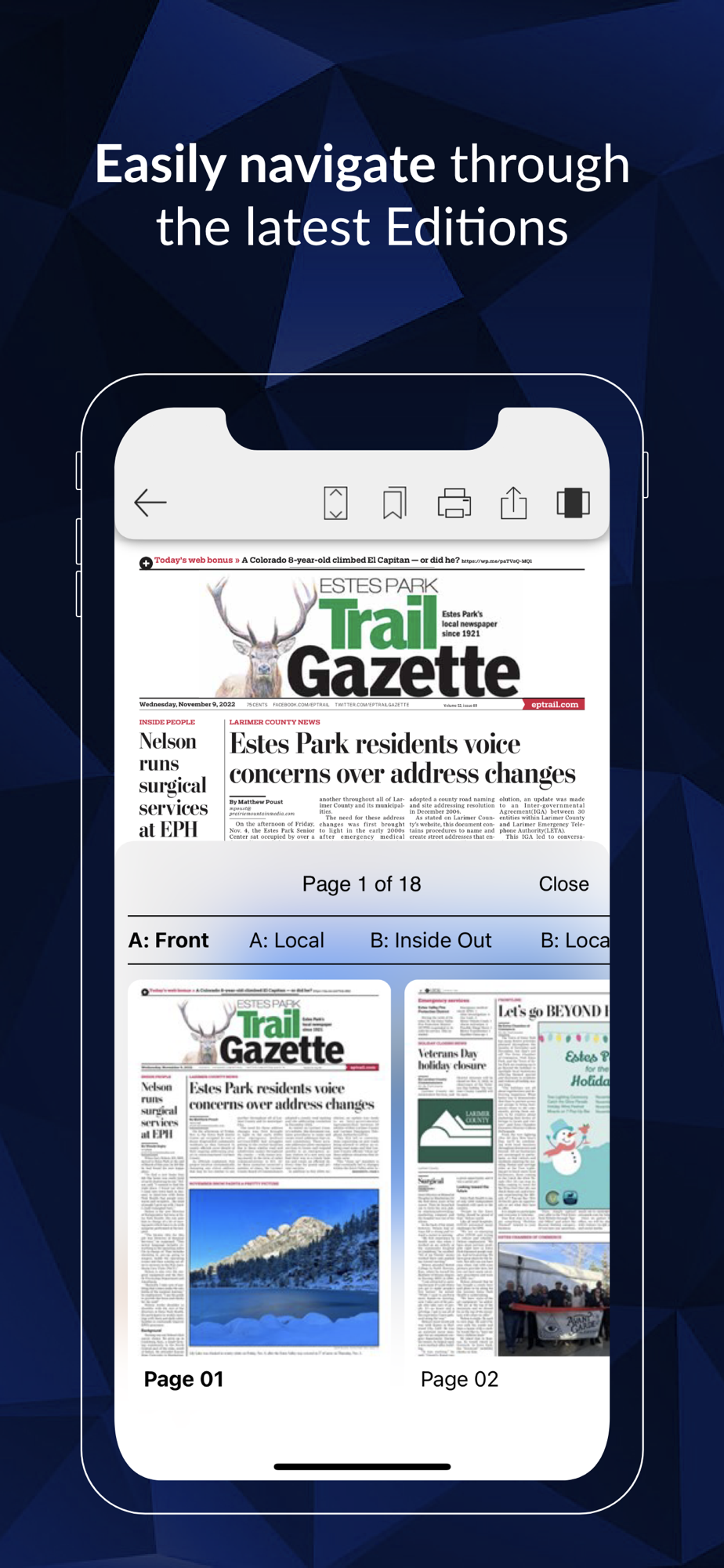 This app is specifically for Estes Park Trail-Gazette e-edition readers. It was designed for ease of use for our e-edition readers. You can access the digital version of the Estes Park Trail-Gazette daily and even view old editions.