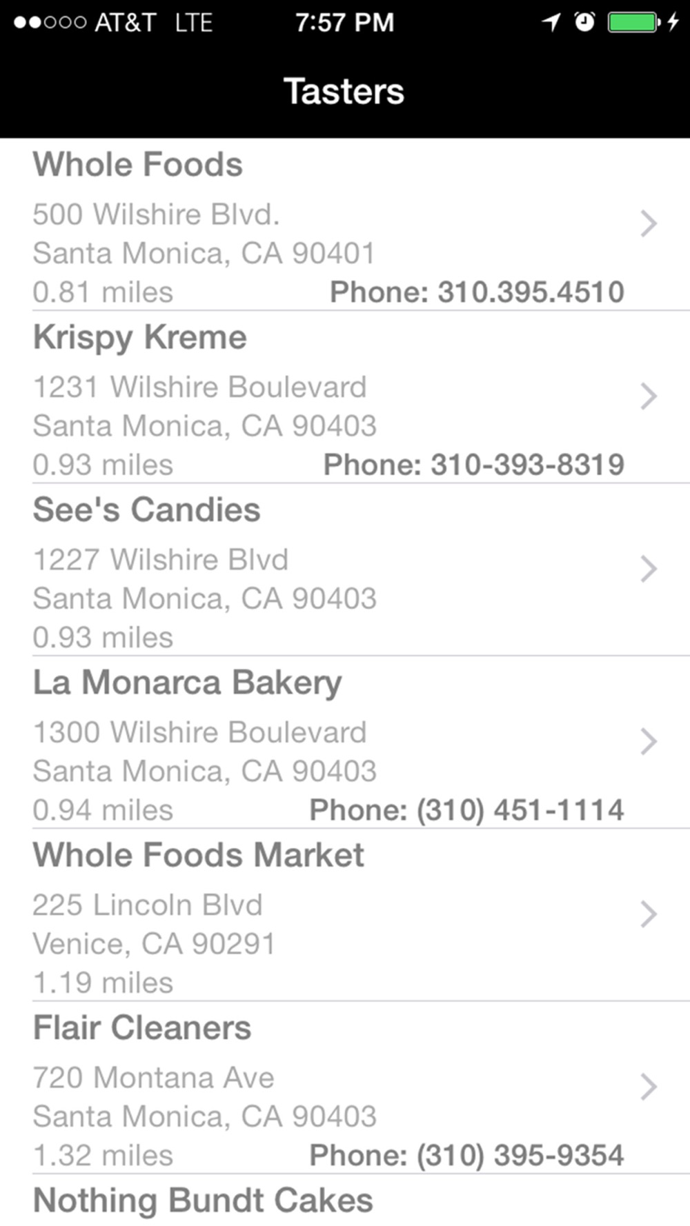 Touch the Tasters application, and your location will be automatically be determined. Then, the Tasters app will display the closest business that offer FREE SAMPLES. Scroll through the listings to find what you are looking for and to see if there are any special offers for the day.