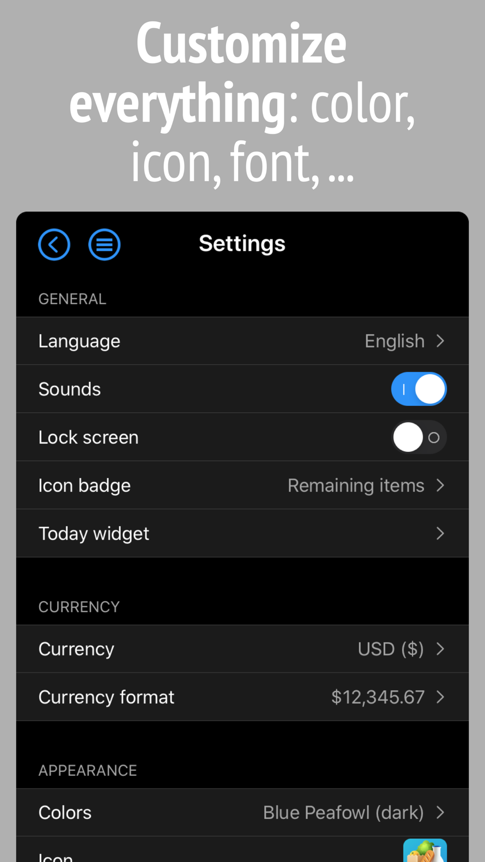 ● Customize IntelliList by choosing among 46 color templates, 22 different icons and 20 fonts.