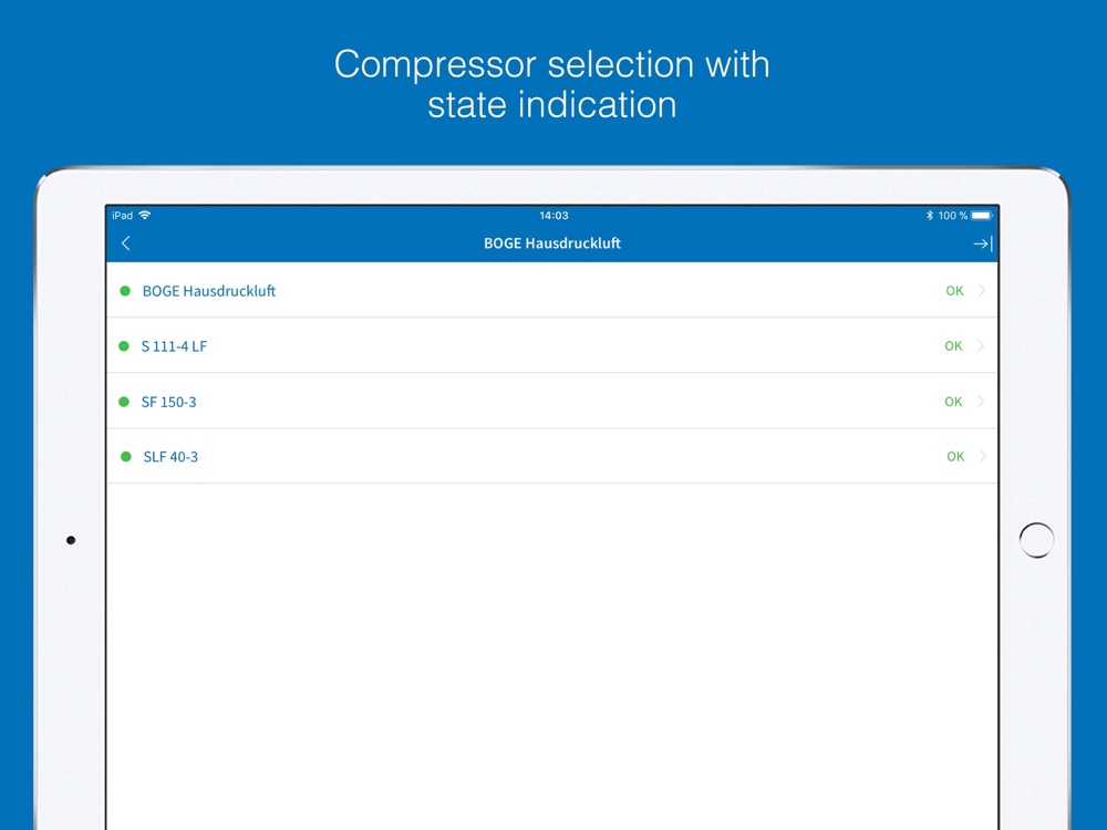 Further compressors and compressed air stations can be added, modified or deleted at any time by accessing to the BOGE airstatus web service. Finally this App is intended for the user and rights management of your compressor stations.