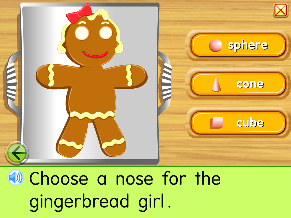 The Starfall Gingerbread app is a delicious way to learn 2D and 3D shapes. Children choose a girl or boy cookie, then decorate it with shapes and colors. In this App edition, create a tray of gingerbread cookies, then choose a favorite cookie to run through a maze following shapes or shape patterns. Run the maze again and again, it’s different every time!