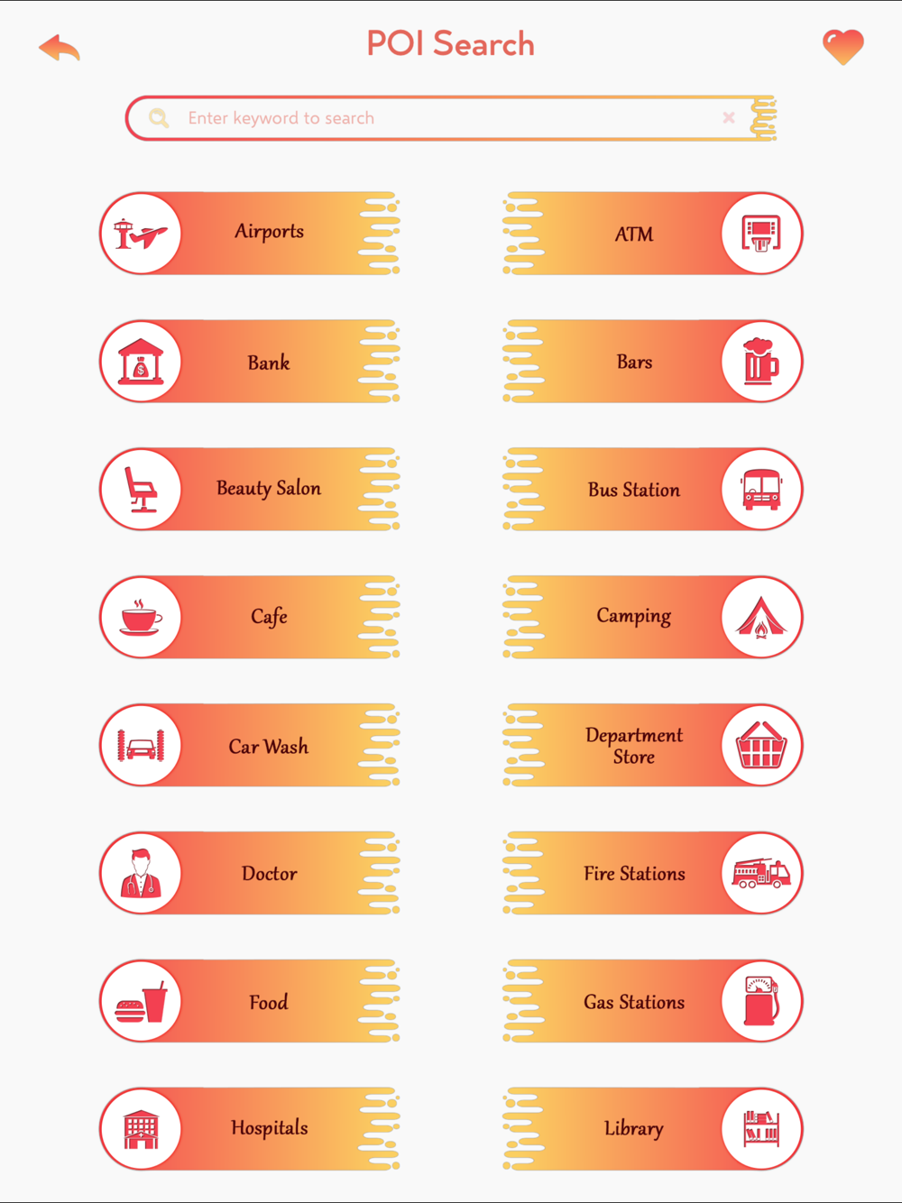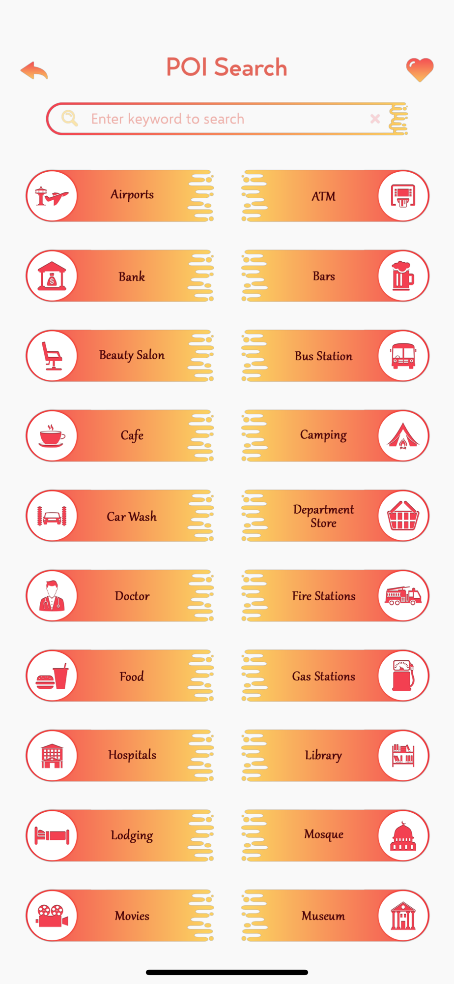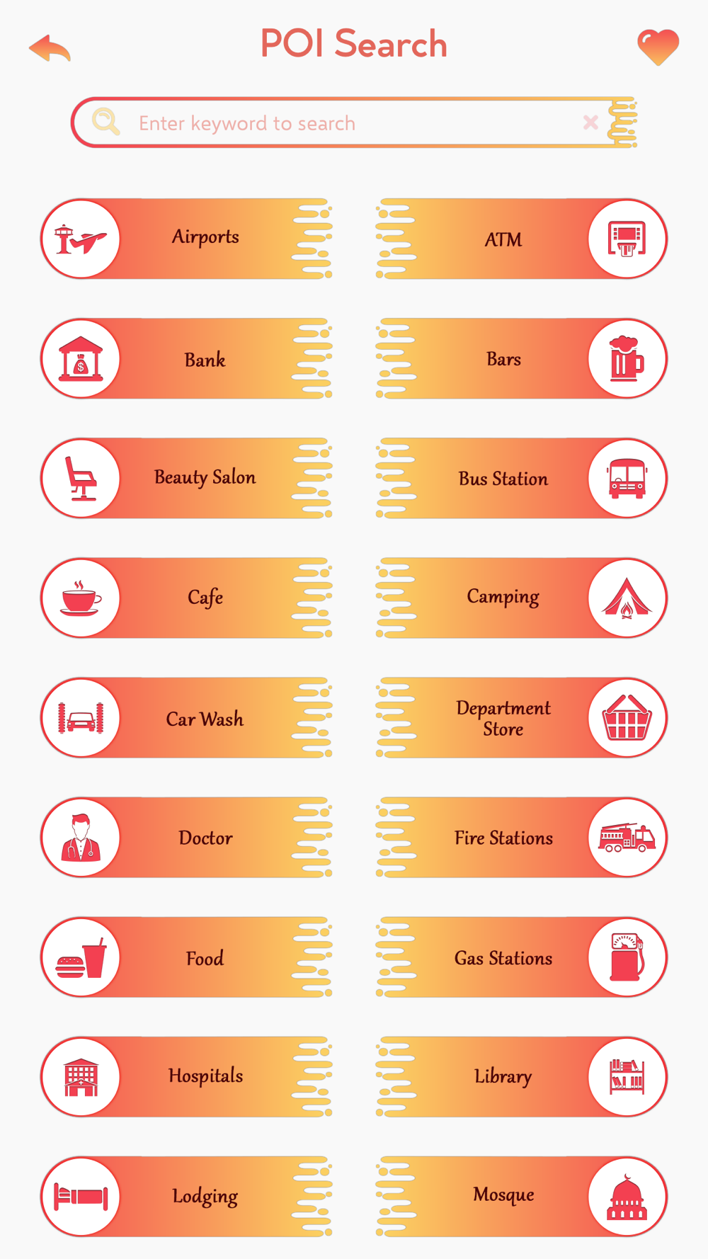 Airport, ATM, Bank, Bars, Beauty Salon, Bus Station, Cafe, Campground, Car Wash, Department Store, Doctor, Fire Station, Food, Gas Station, Hospital, Library,Lodging, Mosque, Movies, Museum, Park, Parking, Pharmacy, Pizza, Police, Shopping, Stadium, Taxi, Train Station, Travel Agency, University, Zoo.