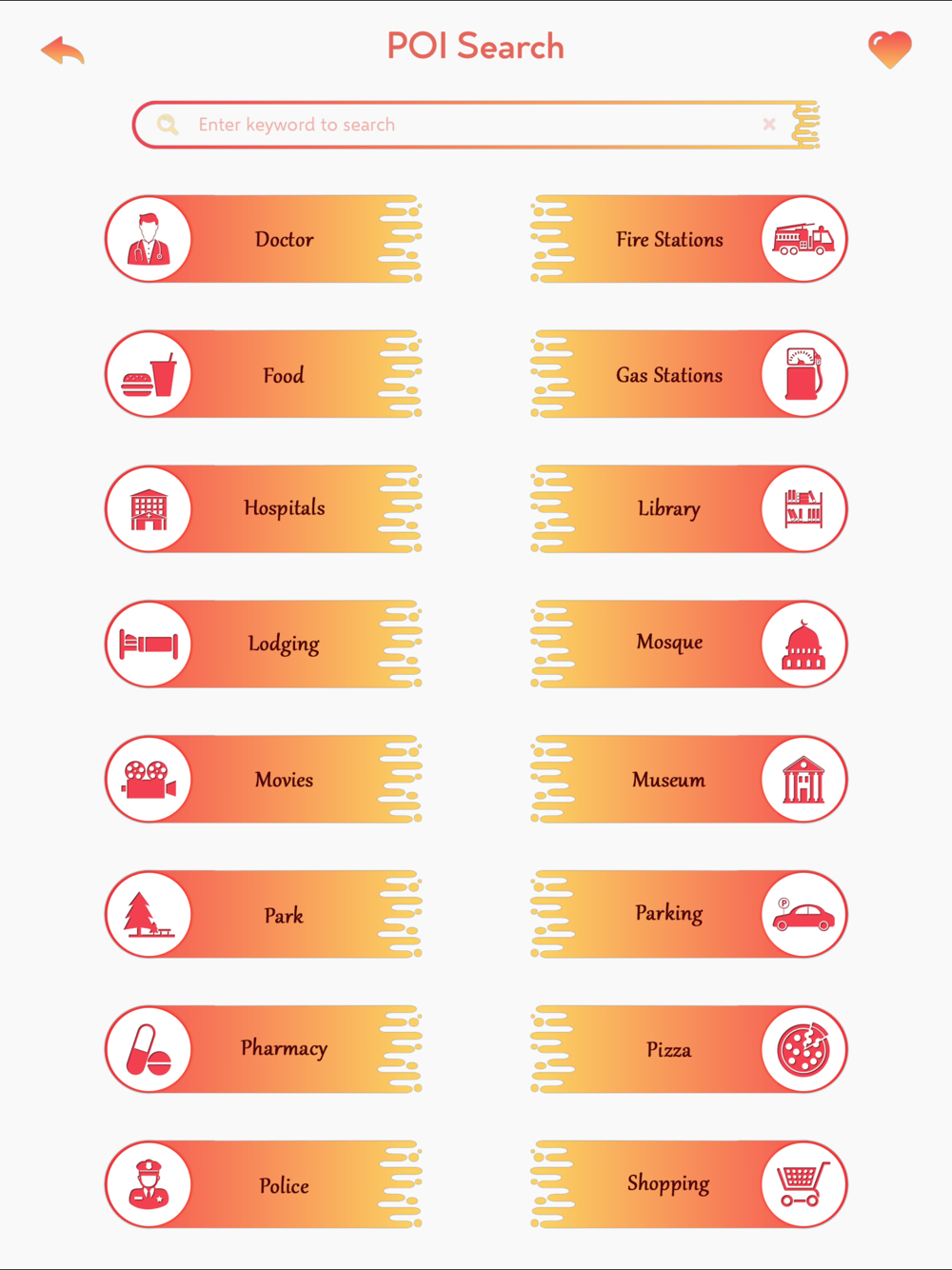 Airport, ATM, Bank, Bars, Beauty Salon, Bus Station, Cafe, Campground, Car Wash, Department Store, Doctor, Fire Station, Food, Gas Station, Hospital, Library,Lodging, Mosque, Movies, Museum, Park, Parking, Pharmacy, Pizza, Police, Shopping, Stadium, Taxi, Train Station, Travel Agency, University, Zoo.