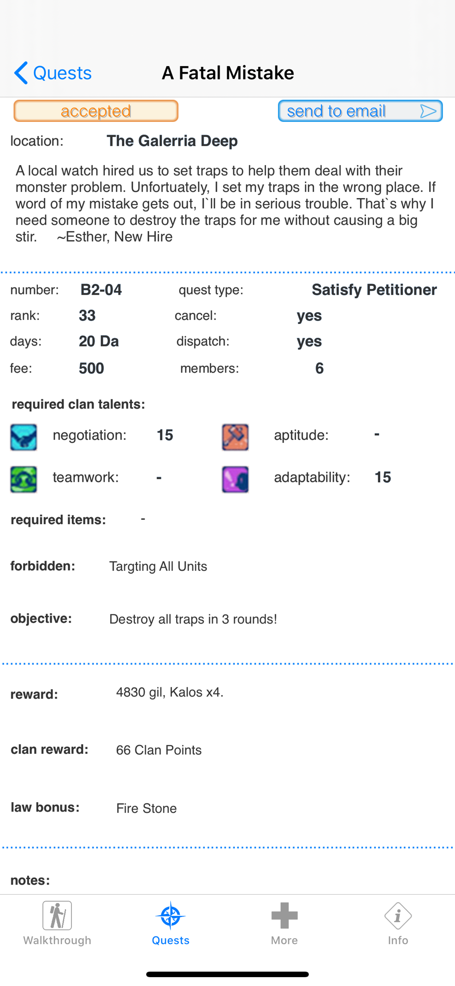 - a complete list of all 300 quests, along with all the necessary info (location, type, rank, fee, days, rewards, requirements, law, etc…) and notes helping to complete each quest. You can send whole quest info on email and set quest status: accepted, completed, dispatched, cancelled so you know which quests you still need to complete.