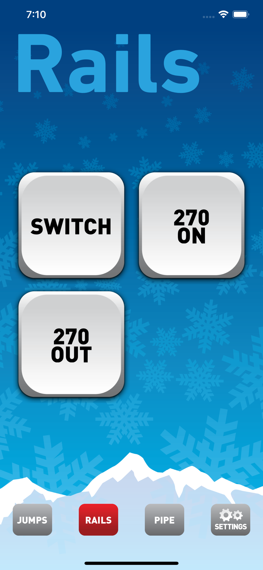 Now you can choose up to 3 tricks in a row to roll. Jump, rail to jump, an all rail jib session or any combo of your choosing. Practice going back to back tricks down the park as you roll the dice and swipe along to see your line. The app automatically realizes if you come in switch from a feature to hit the next feature the same way so no more reverting around. Your now set to go, challenge yourself and become a better slope style rider.