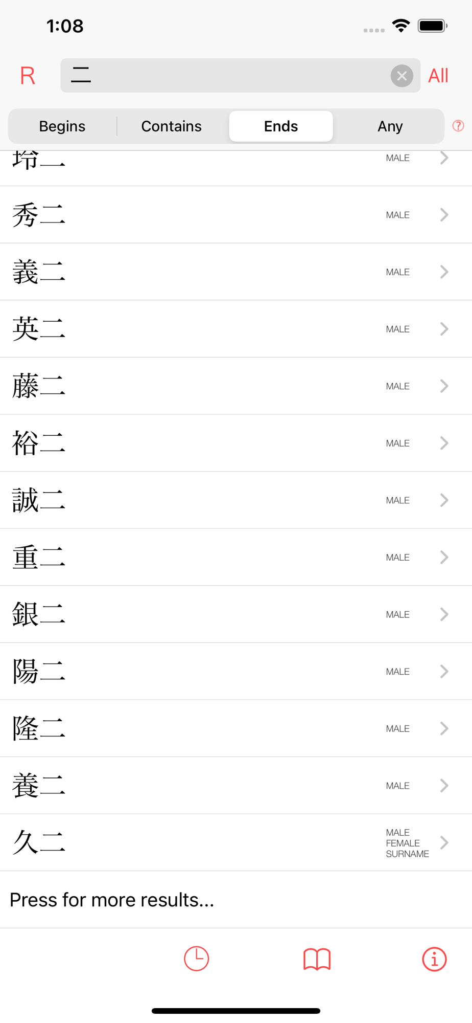 * Enables finding the kanji version corresponding to any of the numerous romanized variants. For example, Jun'ichirō, which can be written in kanji in at least 87 ways such as 純一郎, 潤一朗 and 凖市郎, and has at least 168 romanized variants such as Jun'ichiro, Junichiroo, Junichirou, Junichiroh, and Zyun'itirô.