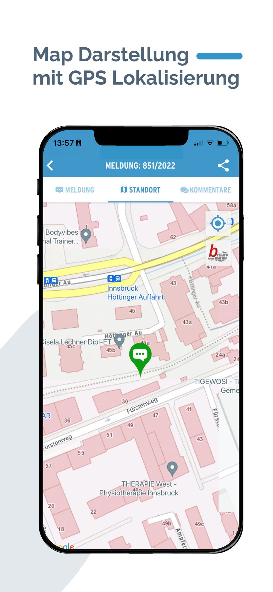Mit der Bürgermeldungen (dem Mängelmelder System) IPhone App können Sie ganz unkompliziert Mängel im öffentlichen Raum an das Stadtamt bzw. die Gemeinde melden, ganz egal ob Schlaglöcher, stehende Pfützen bei Regenwetter, behindertenfeindliche Gehsteigkanten, zugewachsene Gehwege und Verkehrsschilder, mangelhafte Bus-Haltestellen, falsch eingesetzte Kanaldeckel oder Schäden an öffentlichen Einrichtungen.